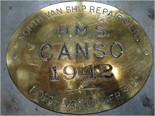 (GHD001) HMS CANSO builder's plaque. Originally laid down for the Royal Navy, she was transferred to the RCN prior to completion and commissioned as HMCS CANSO.