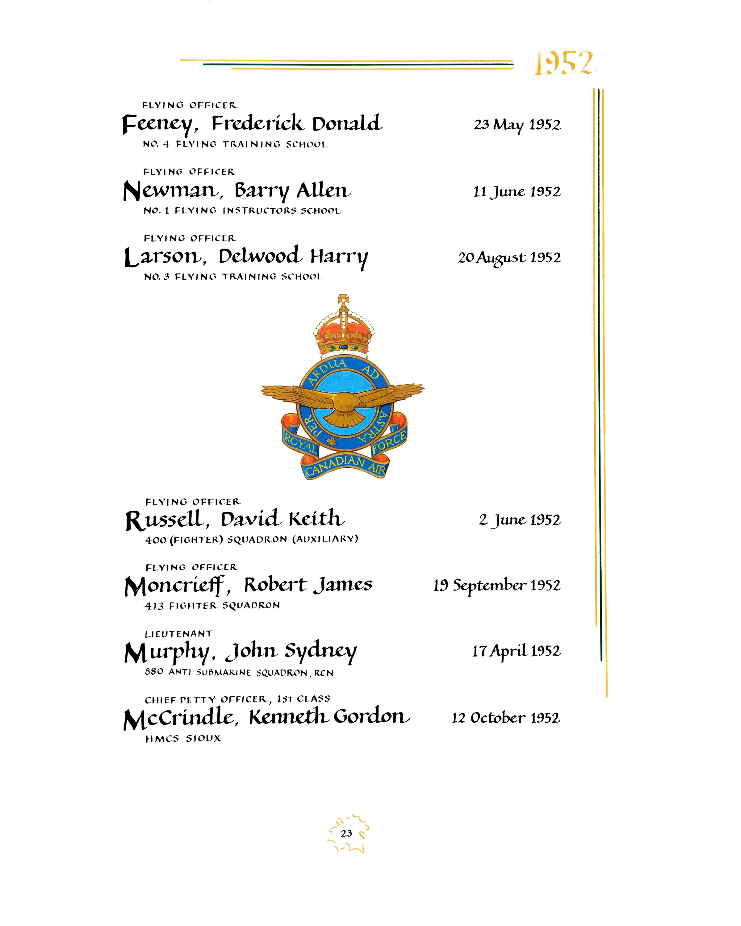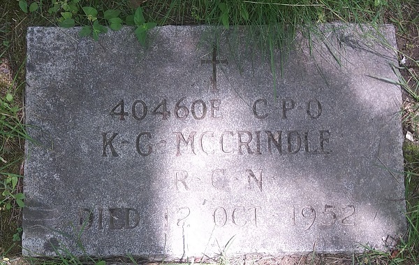 McCRINDLE, Kenneth Gordon, CPO, 40460, RCN, died - 12 Oct 1952, HMCS SIOUX - Son of John and Matilda McCrindle; husband of Vera McCrindle; father of Marcia McCrindle all of Victoria, BC.