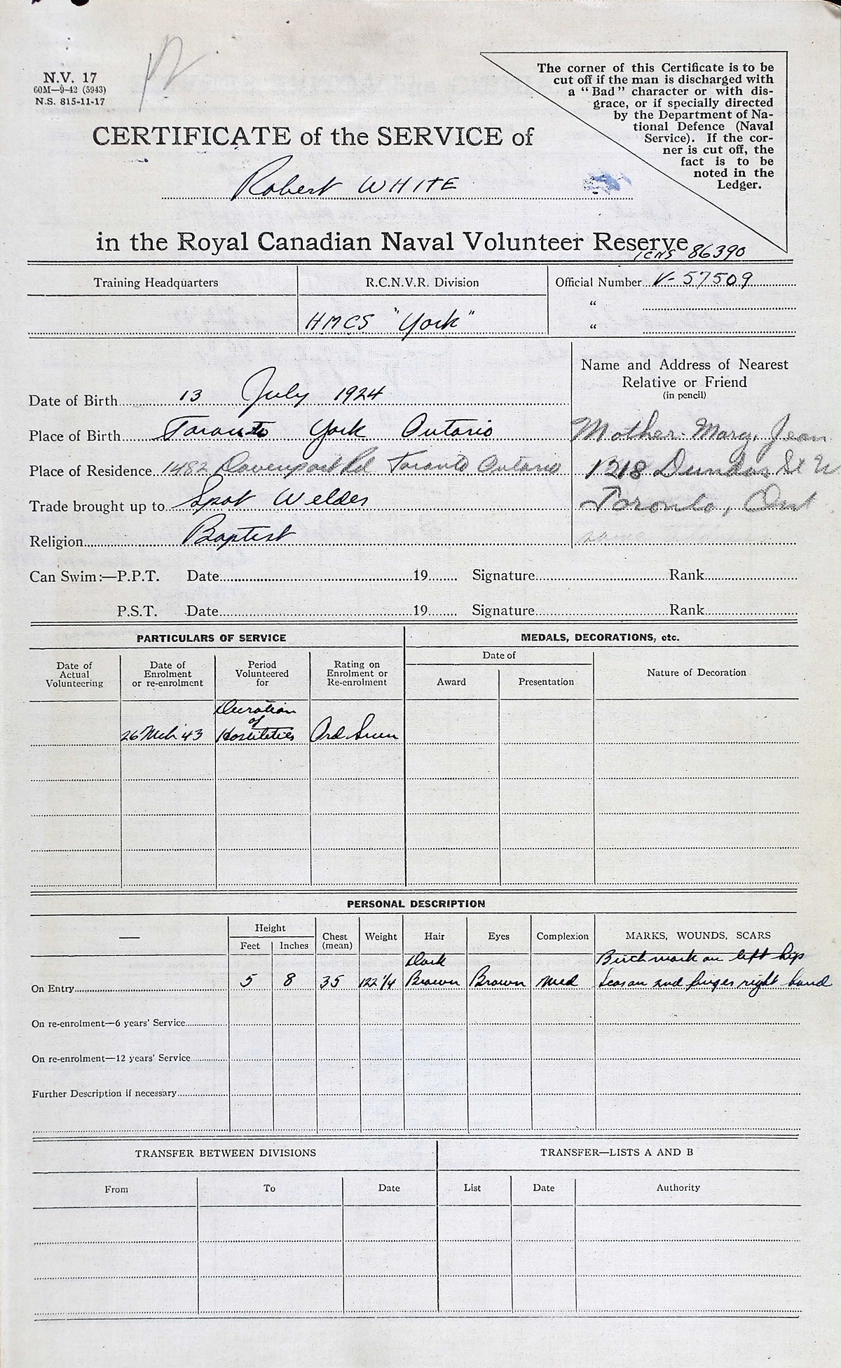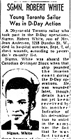 WHITE, Robert, Sig, V57509, RCNVR, died - 07 Sept 1944, HMCS SIOUX - Son of Joseph White (deceased) and Mrs. Jean white Anderson, Toronto, ON.