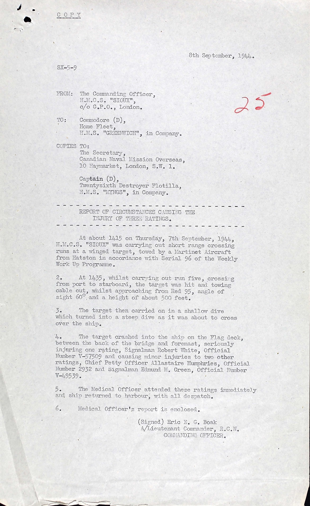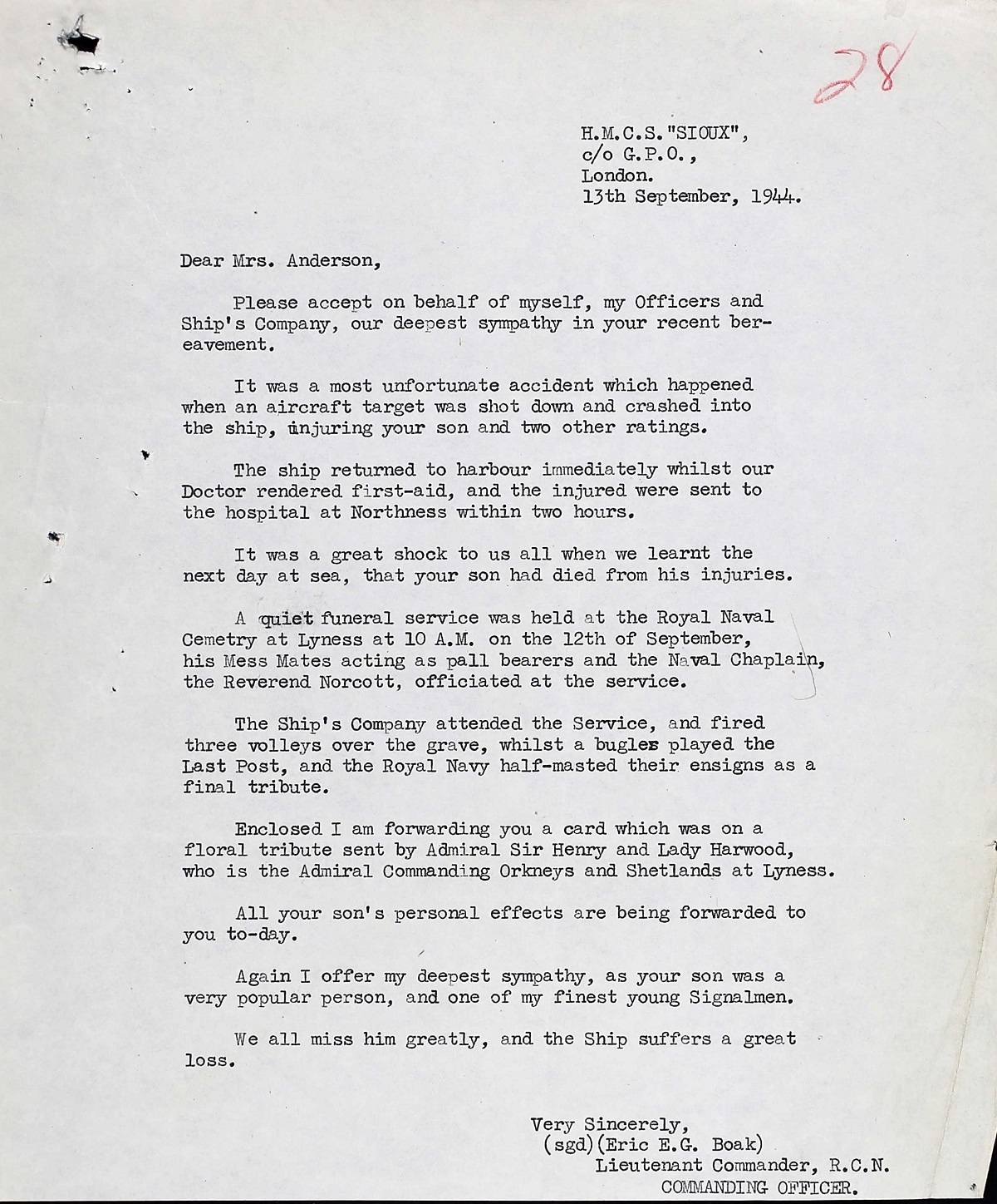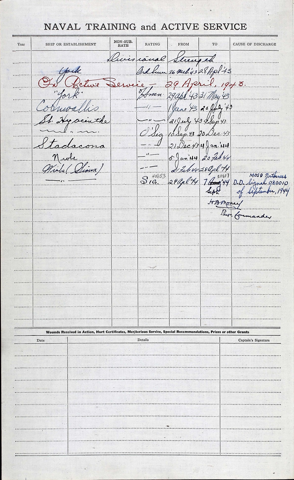 Ships served in: HMCS YORK - Enlisted 26 Mar 1943. Commenced Active Service 29 Apr 1943 HMS VIXEN / HMCS SIOUX - Drafted to VIXEN 29 Jan 1944 as a Sig, RCNVR. Commissioning crew HMCS SIOUX