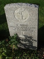 Signalman Robert White died on 07 Sep 1944 in the Royal Naval Sick Quarters, Northness, Scotland, due to fatal injuries received when a towed aircraft target was shot down during anti-aircraft gunnery practise and struck the ship. He was buried in the Imperial War Graves Cemetery, Orkney, Scotland on 12 Sep 1944.