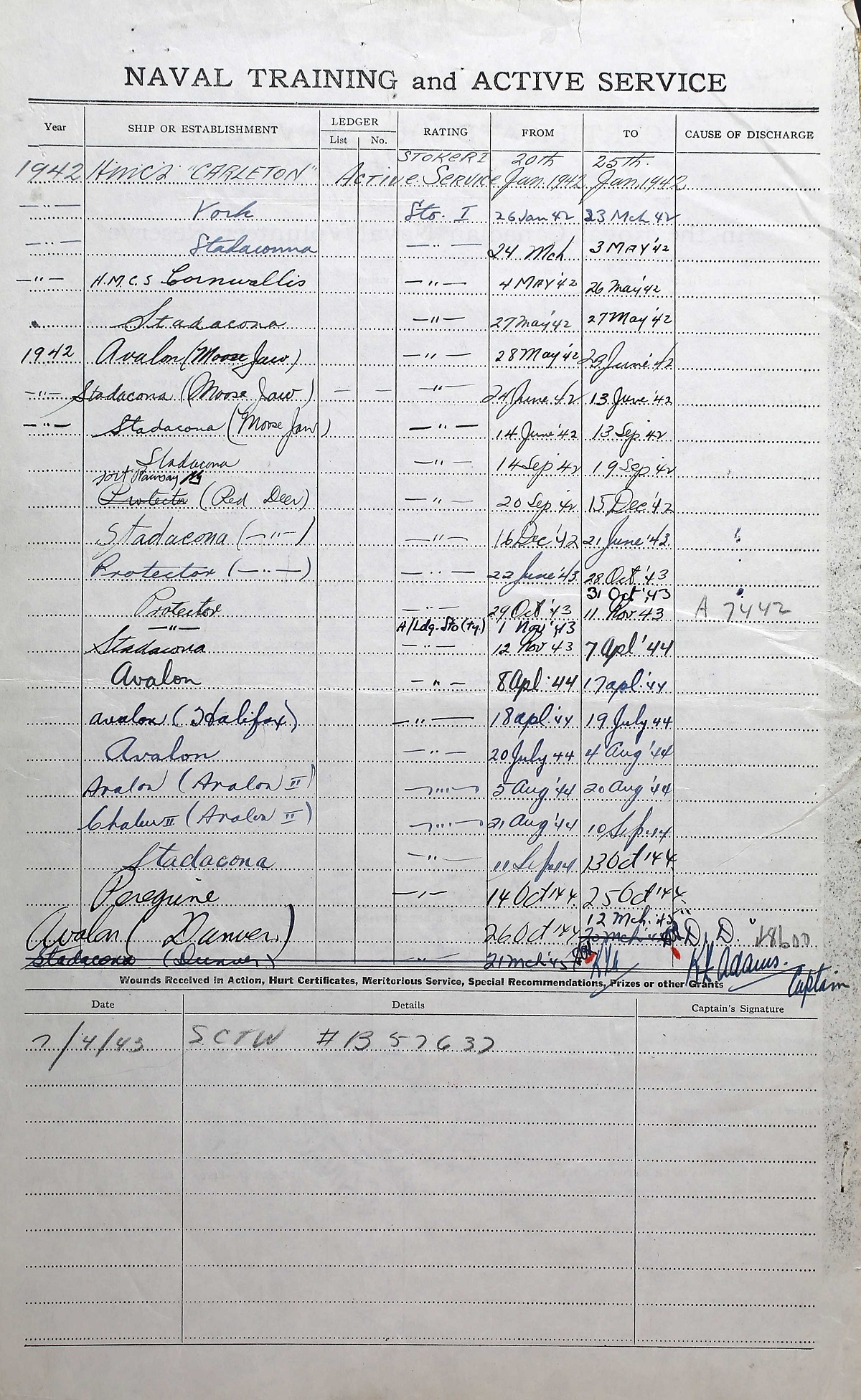 Ships served in: HMCS CARLETON - Enlisted / Commenced Active Service 20 Jan 1942. HMCS YORK - Served in York 26 Jan 1942 - 23 Mar 1942 as a Sto 1c, RCNVR HMCS MOOSE JAW - Served in MOOSE JAW 28 May 1942 - 13 Sep 1942 as a Sto 1c, RCNVR HMCS RED DEER - Served in RED DEER 20 Sep 1942 - 28 Oct 1943 as a Sto 1c, RCNVR HMCS HALIFAX - Served in HALIFAX 18 Apr 1944 - 19 Jul 1944 as an A/L/Sto, RCNVR HMCS AVALON II - Served in AVALON II 05 Aug 1944 - 10 Sep 1944 as an A/L/Sto, RCNVR HMCS DUNVER - Drafted to DUNVER 26 Oct 1944