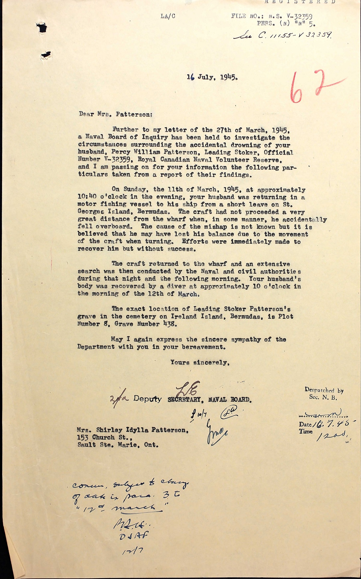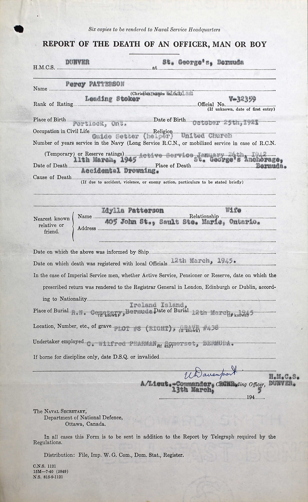 Leading Stoker P. W. Patterson drowned on St. George Island, Bermuda. The drowning occurred as Patterson was leaving in a liberty boat to board his ship HMCS DUNVER. As the boat pulled away from the pier, L/Sto Patterson fell from the vessel. His body was recovered by divers. He is buried in the Royal Naval Cemetery, Bermuda.