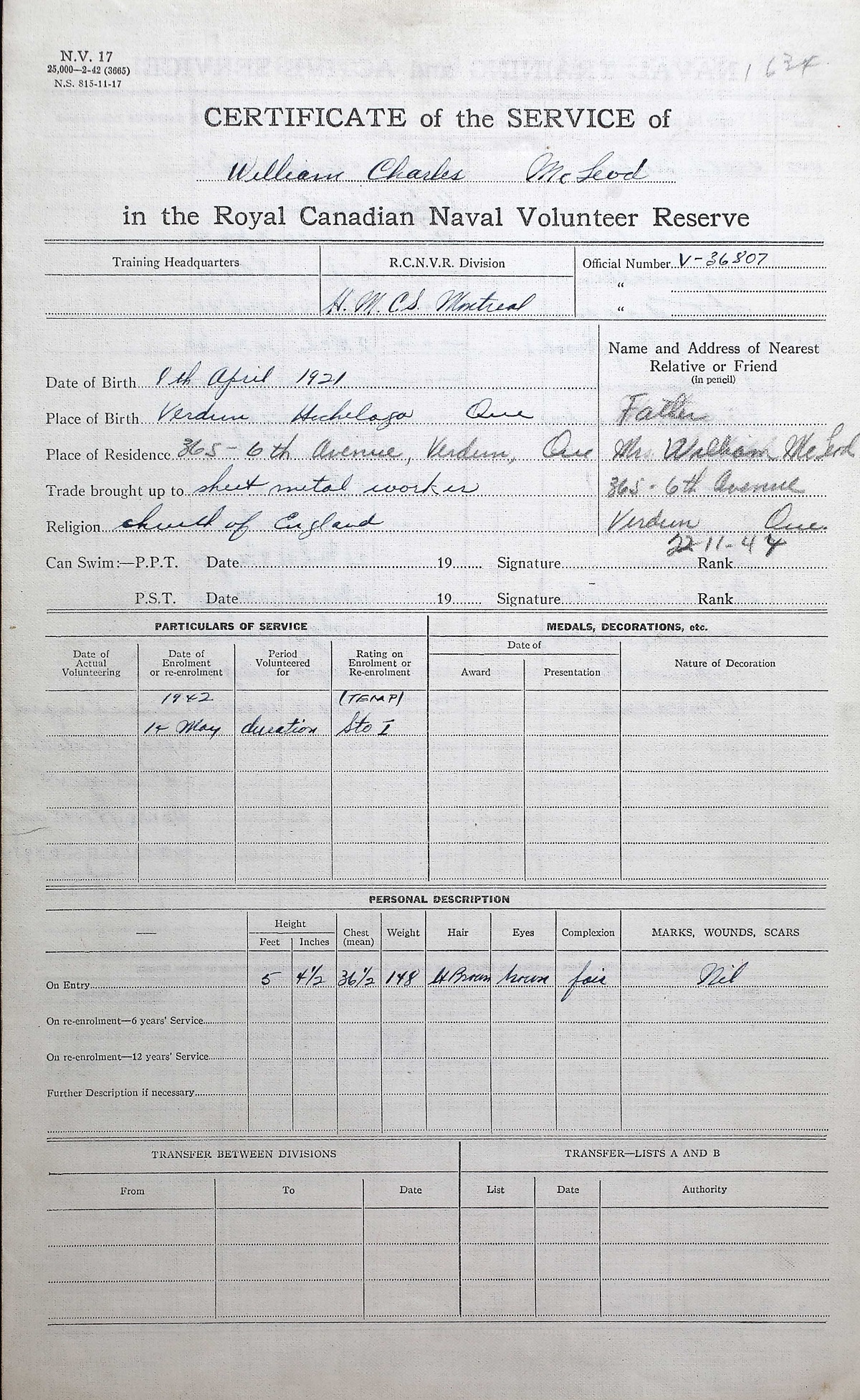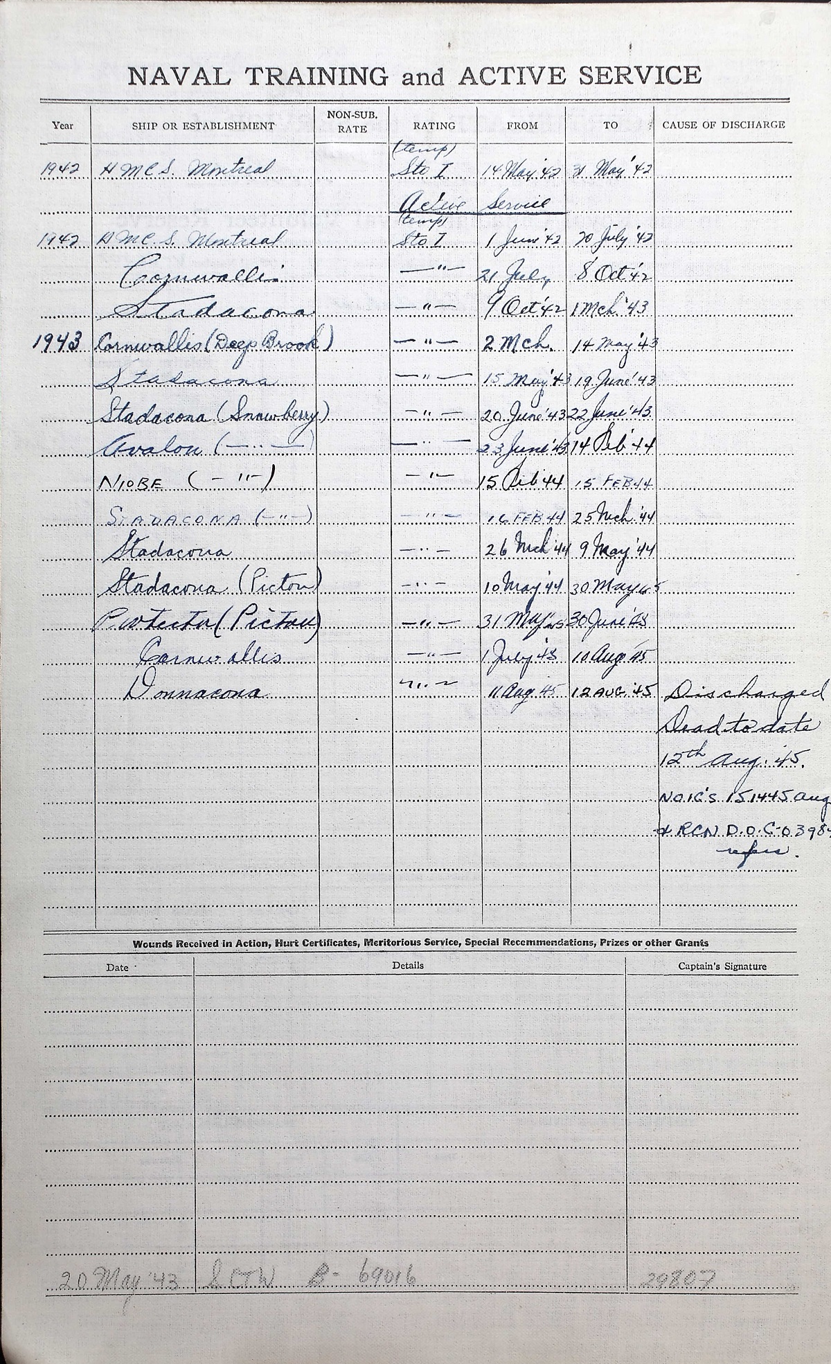 Ships served in: HMCS MONTREAL - Enlisted 14 May 1942. Commenced Active Service 01 Jun 1942 HMCS SNOWBERRY - Served in SNOWBERRY 20 Jun 1943 - 25 Mar 1944 as a Sto 1c, RCNVR HMCS PICTOU - Drafted to PICTOU 10 May 1944 as a Sto 1c, RCNVR