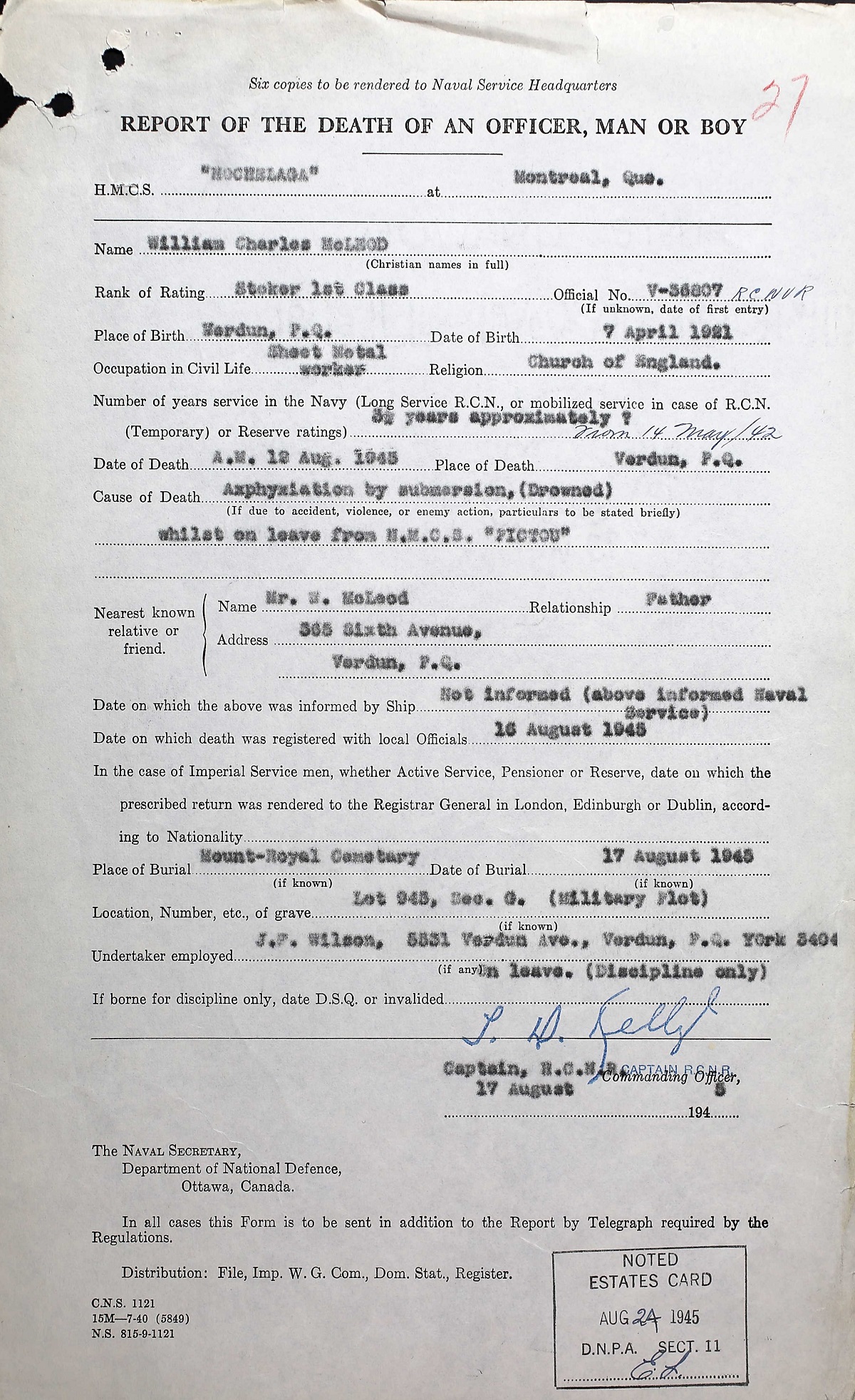 Stoker 1st Class William Charles McLeod drowned while on leave in Verdun, QC. He is buried in the Mount Royal Cemetery, Montréal, QC.