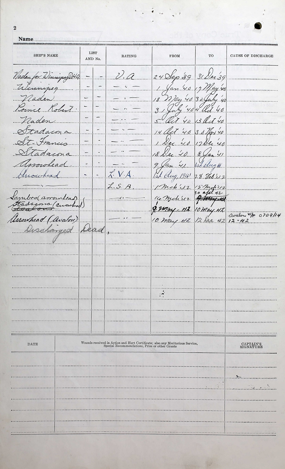 Ships served in: RCNVR DIVISION WINNIPEG - Enlisted 29 Sep 1939. Commenced Active Service 24 Sep 1939 HMCS PRINCE ROBERT - Served in PRINCE ROBERT 31 Jul 1940 - 04 Oct 1940 as a VA, RCNVR HMCS ST FRANCIS - Served in ST FRANCIS 01 Dec 1940 - 17 Dec 1940 as a VA, RCNVR HMCS ARROWHEAD - Served in ARROWHEAD 09 Jan 1941 - 10 May 1942 as a VA, LVA and LSA, RCNVR. Rated LVA 01 Aug 1941. Rated LSA 01 Mar 1942 HMCS AVALON - Drafted to AVALON 10 May 1942 as a LSA, RCNVR