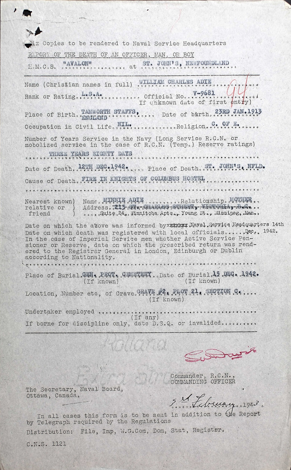 LSA William Adie died on 12 Dec 1942 in the fire at the Knights of Columbus Service Hostel in St. John's, NFLD. He is buried in the Mount Pleasant Cemetery, St. John's, Newfoundland.