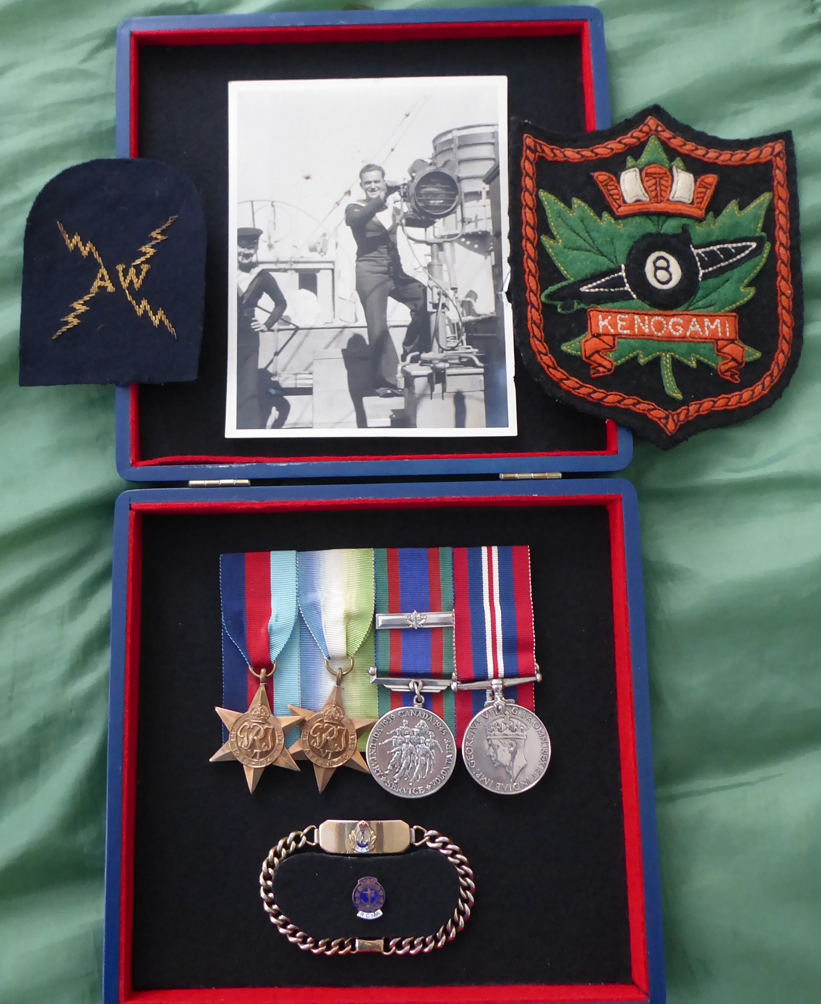 (FR01) Sig Frank R. Oakie (FR02) Frank's medals - the 1939-45 Star, the Atlantic Star, the CVSM and the War Medal 1939-45; a HMCS KENOGAMI jacket patch; Frank on the signal lamp on HMCS KENOGAMI and un unknown trade badge (FR03) Franks Ronson lighter with mini unit badges (FR04) Frank's kiosk at the Metropolitan building Halifax (FR05) A sample of Franks penmanship