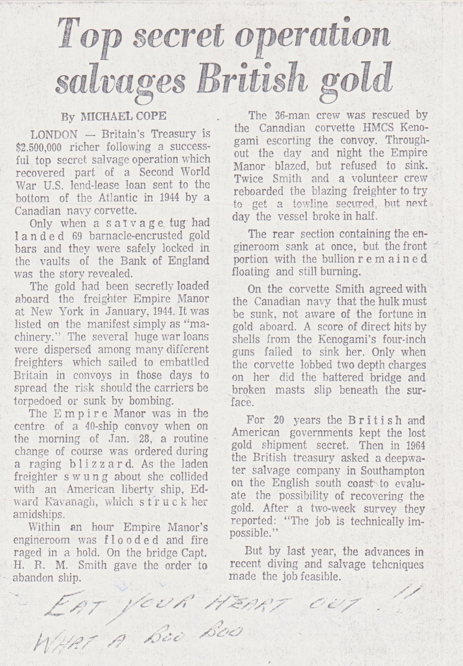 On the subject of gold, the newspaper attachment details the sinking of a damaged freighter by my father's ship. Little did he know but you will see from the article my father either laughed his head off or said some choice words with maybe a few tears dripping into his rum and coke. That is the story I remember most fondly.