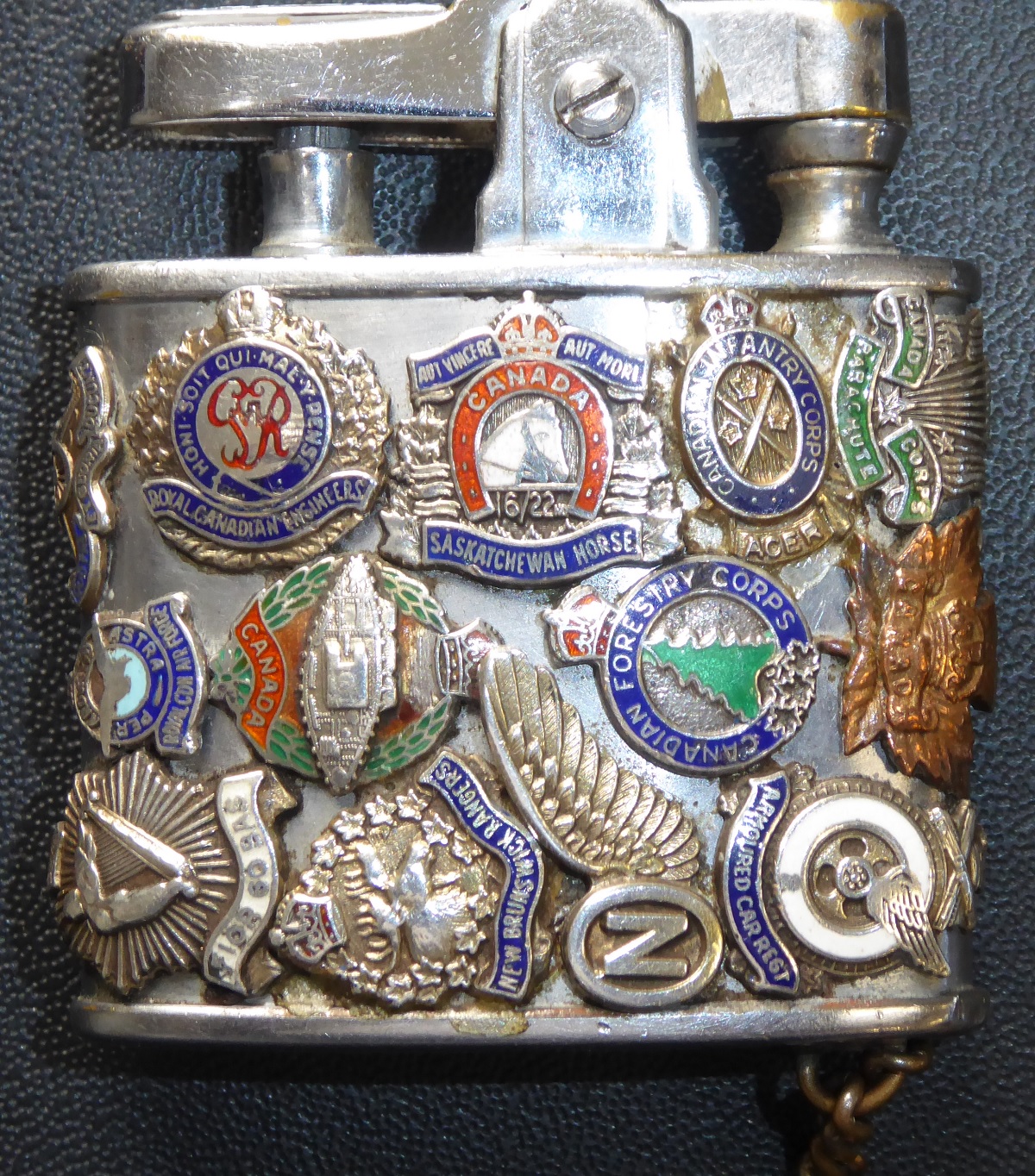 The Ronson lighter which has 20 plus unit badges on it, I am sure this is his own creation. The Ronson company has no record of producing this and all badges are Canadian. The badges are mini replicas that were sold as charms which he had access to for sure.