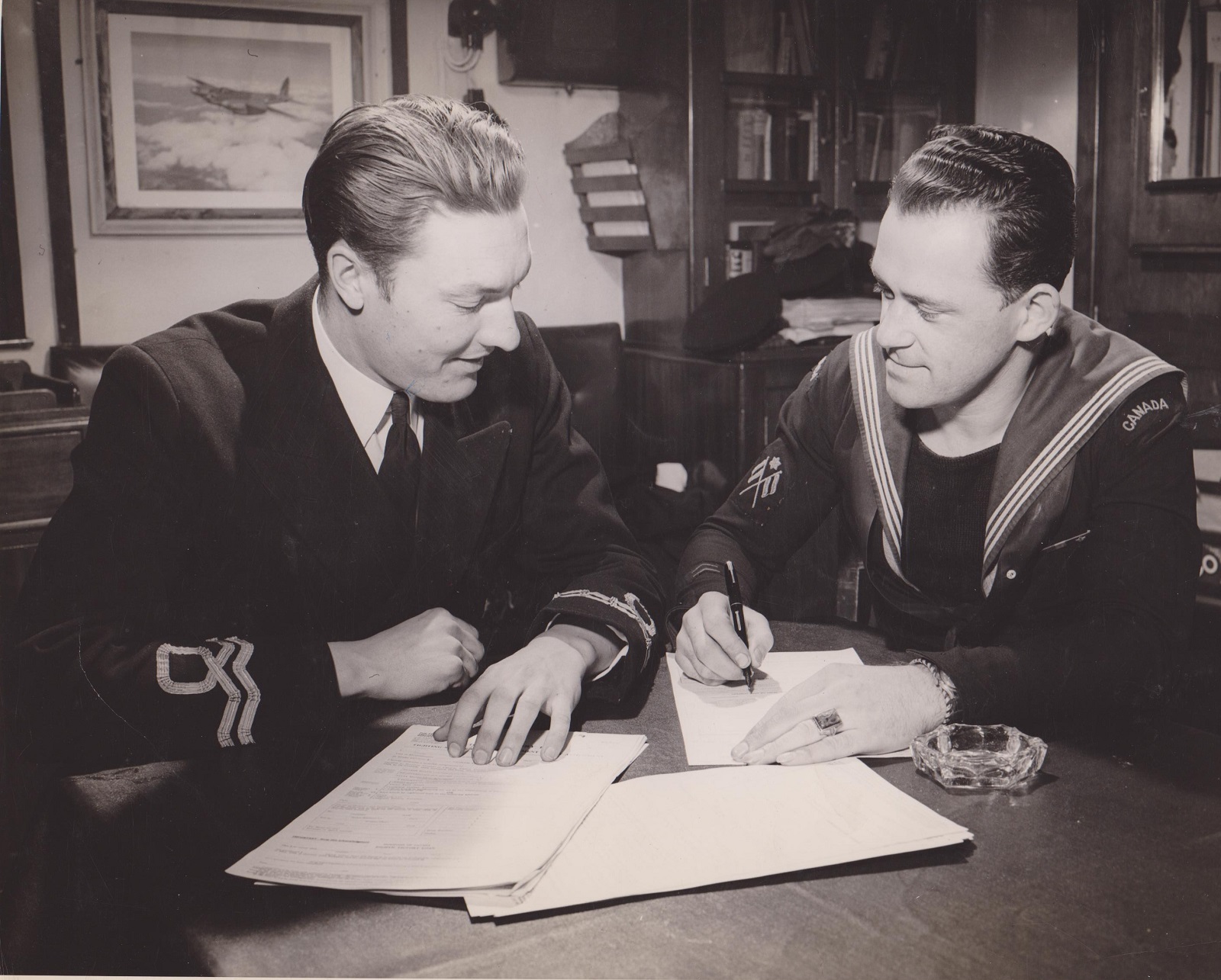 (...) Frank's horse hide jacket - which he is seen wearing in photos onboard HMCS KENOGAMI (...) Sig Frank Oakie (right) with unknown RCNVR Lieutenant - Official RCN photo
