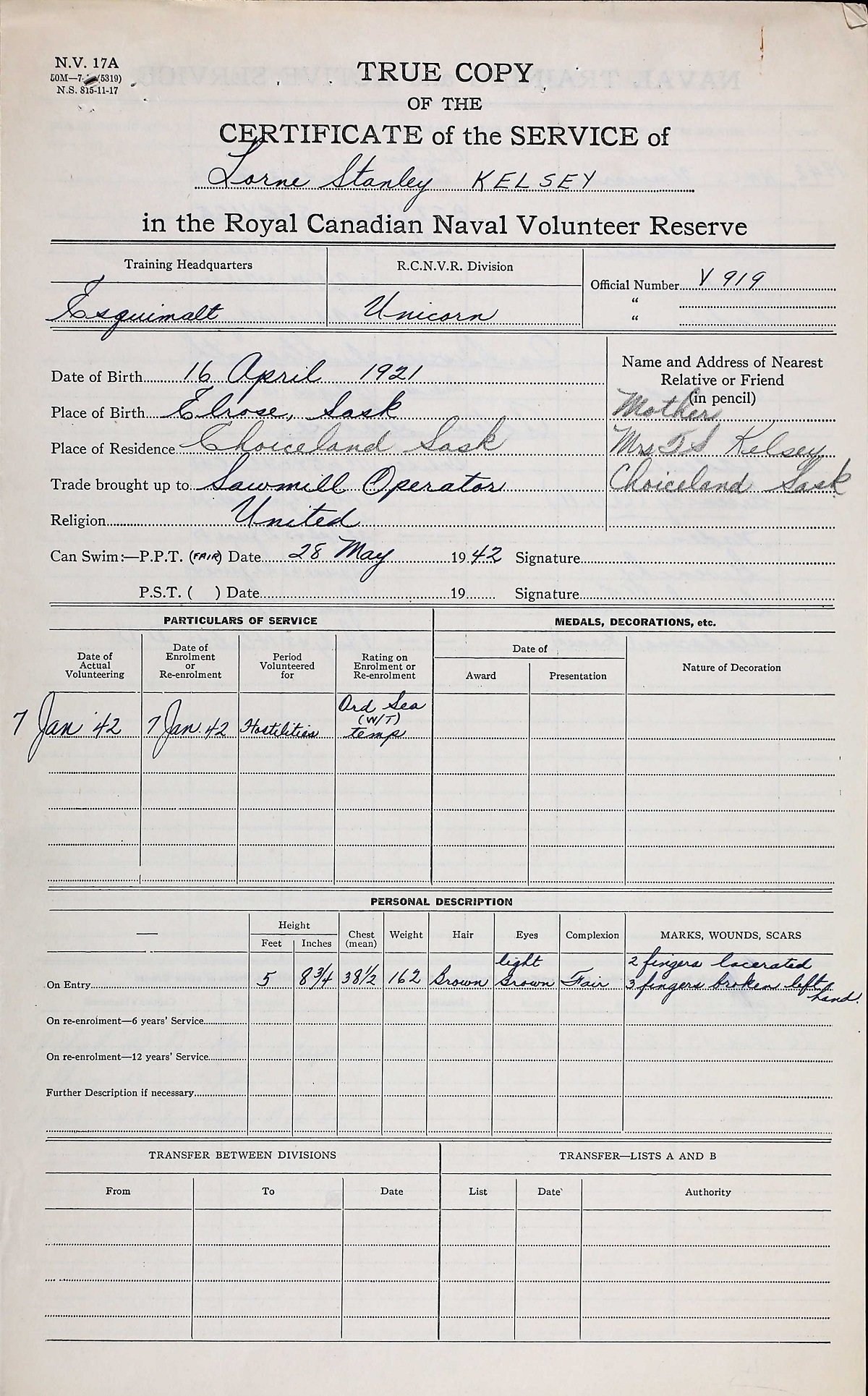 Able Seaman Lorne Stanley Kelsey of Choiceland was the son of Thomas S., a World War I veteran, and Georgiana Agnes (Purdy) Kelsey who originally came from Ontario. In 1931 the family moved from Tate to Choiceland where Thomas operated a sawmill. Lorne was born at Greenan west of Elrose, educated at Choiceland and was working at sawmills in Saskatchewan, Manitoba and Ontario when he enlisted on January 07, 1942 at Saskatoon, Saskatchewan.