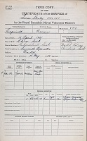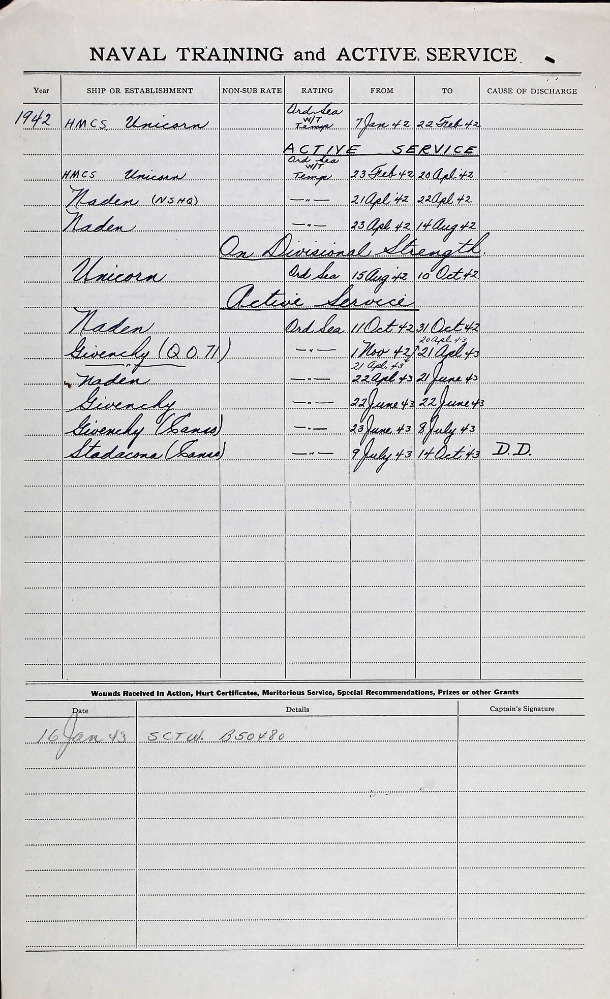 Ships served in: HMCS UNICORN - Enlisted 07 Jan 1942. Commenced Active Service 23 Feb 1942 HMCS UNICORN - On Divisional Strength (not on active service) - 15 Aug 1942 - 10 Oct 1942 for Agricultural Leave ML Q071 - Served in Q072 01 Nov 1942 - 20 Apr 1943 as an OS, RCNVR HMCS GIVENCHY - Served in GIVENCHY 22 Jun 1943 (1 day) HMCS CANSO - Drafted to CANSO 23 Jun 1943 as an OS, RCNVR