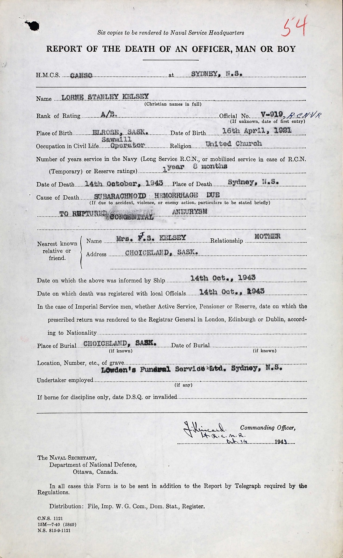 KELSEY, Lorne Stanley, AB, V919, RCNVR, died - 14 Oct 1943, HMCS CANSO - Son of Thomas S. and Georgina Agnes Kelsey, of Choiceland, SK.