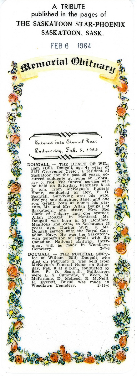 DOUGALL, William James (Bill) - The Death of William (Bill) Dougall, age 41 years of 2127 Grosvenor Cresc., a resident of Saskatoon for the past 36 years, occurred suddenly at home on February 5, 1964. The funeral service will be held on Saturday, February 8 at 2 p.m. from McKague's Funeral Home, conducted by Rev. P.O. Scargall. Surviving are: his wife, Evelyn; one daughter, Jane, and one son, Grant, both at home; his parents, Mr. and Mrs. Allan Dougall of Saskatoon; one sister, Mrs. Mel Clark of Calgary and one brother, Allan Dougall in Montreal. Mr. Dougall was born in St. Boniface, Manitoba and came to Saskatoon 36 years ago. During W.W. 2, Mr. Dougall served with the Royal Canadian Navy. He was the Saskatchewan Supervisor of Signals with the Canadian National Railway. Interment will be made in Woodlawn Cemetery.