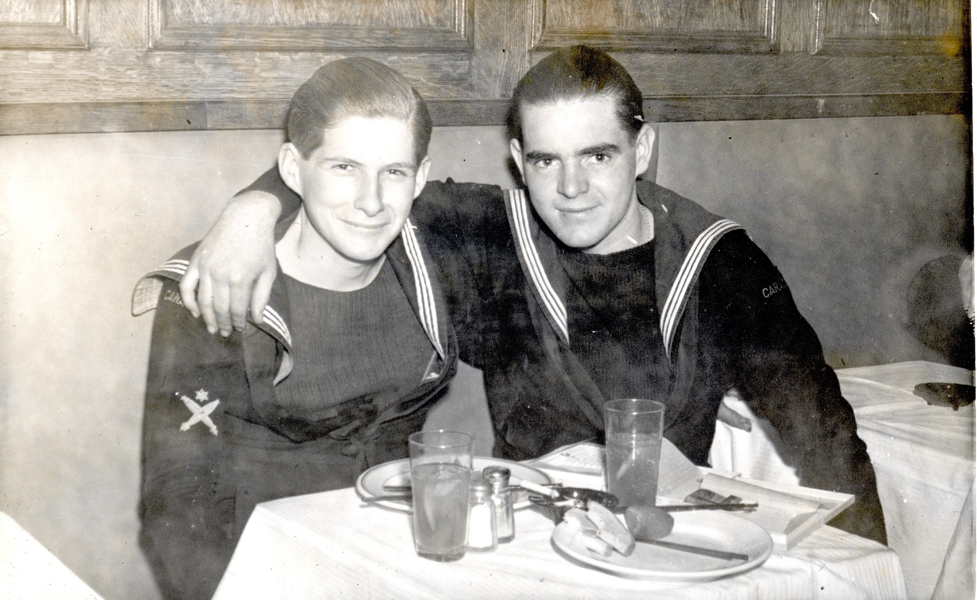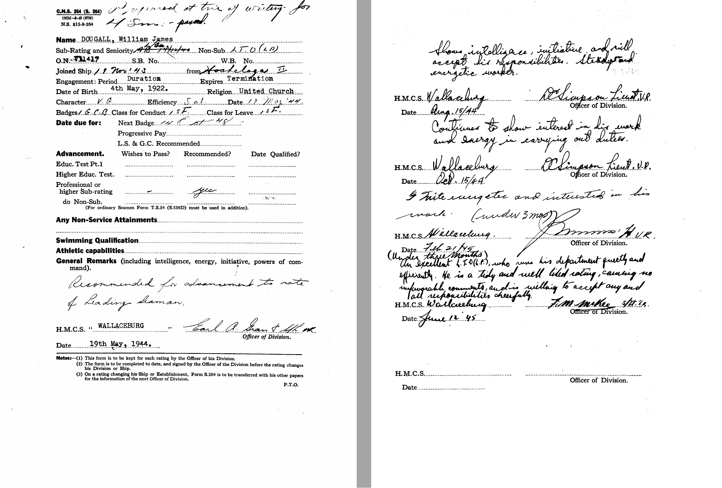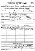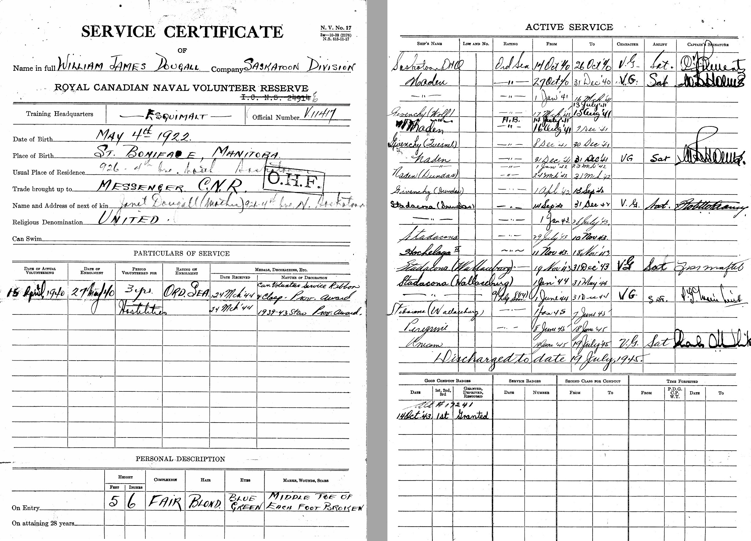 Ships served in: RCNVR DIVISION SASKATOON - Enlisted 15 Apr 1940. Commenced Active Service 14 Oct 1940 HMCS WOLF - Served in Wolf 17 Mar 1941 - 15 Aug 1941 as an OS and AB ST, RCNVR. Rated AB 14 Jul 1941 HMCS QUESNEL - Served in QUESNEL 08 Dec 1941 - 30 Dec 1941 as an AB ST, RCNVR HMCS DUNDAS - Served in DUNDAS 24 Mar 1942 - 28 Jul 1943 as an AB LTO, RCNVR HMCS WALLACEBURG - Served in WALLACEBURG 19 Nov 1943 - 07 Jun 1945 as an AB LTO (LP) and A/LS LTO (LP), RCNVR. Rated A/LS 01 Jun 1944. HMCS UNICORN - Drafted to UNICORN 19 Jun 1945. Demobilized 19 Jul 1945 as an A/LS, RCNVR