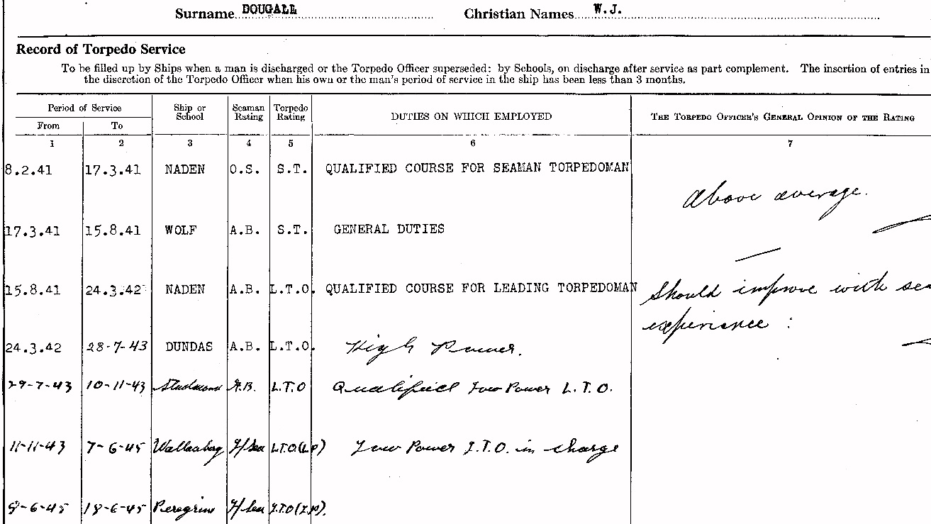 (WD01) Portrait of A/LS LTO (LP) William (Bill) Dougall (WD02) Certificate of Service - pages 1 and 2 (WD03) Quarterly assessments while drafted to WALLACEBURG (WD04) Pre-Enrollment History & Service History (WD05) Record of Torpedo Service