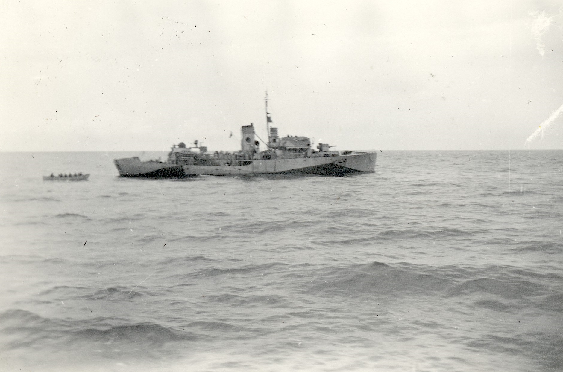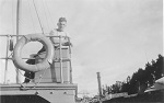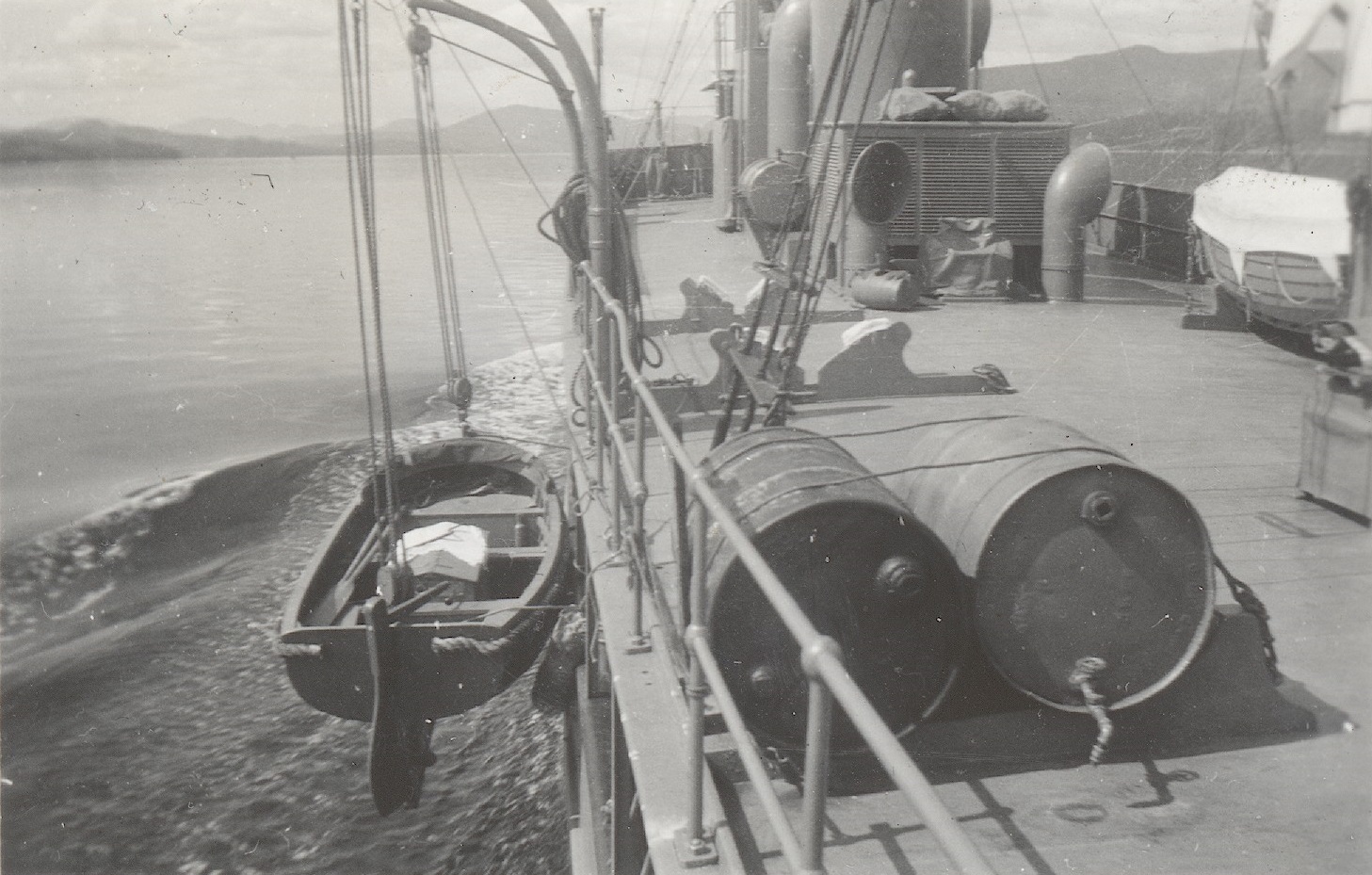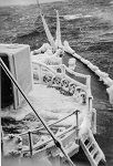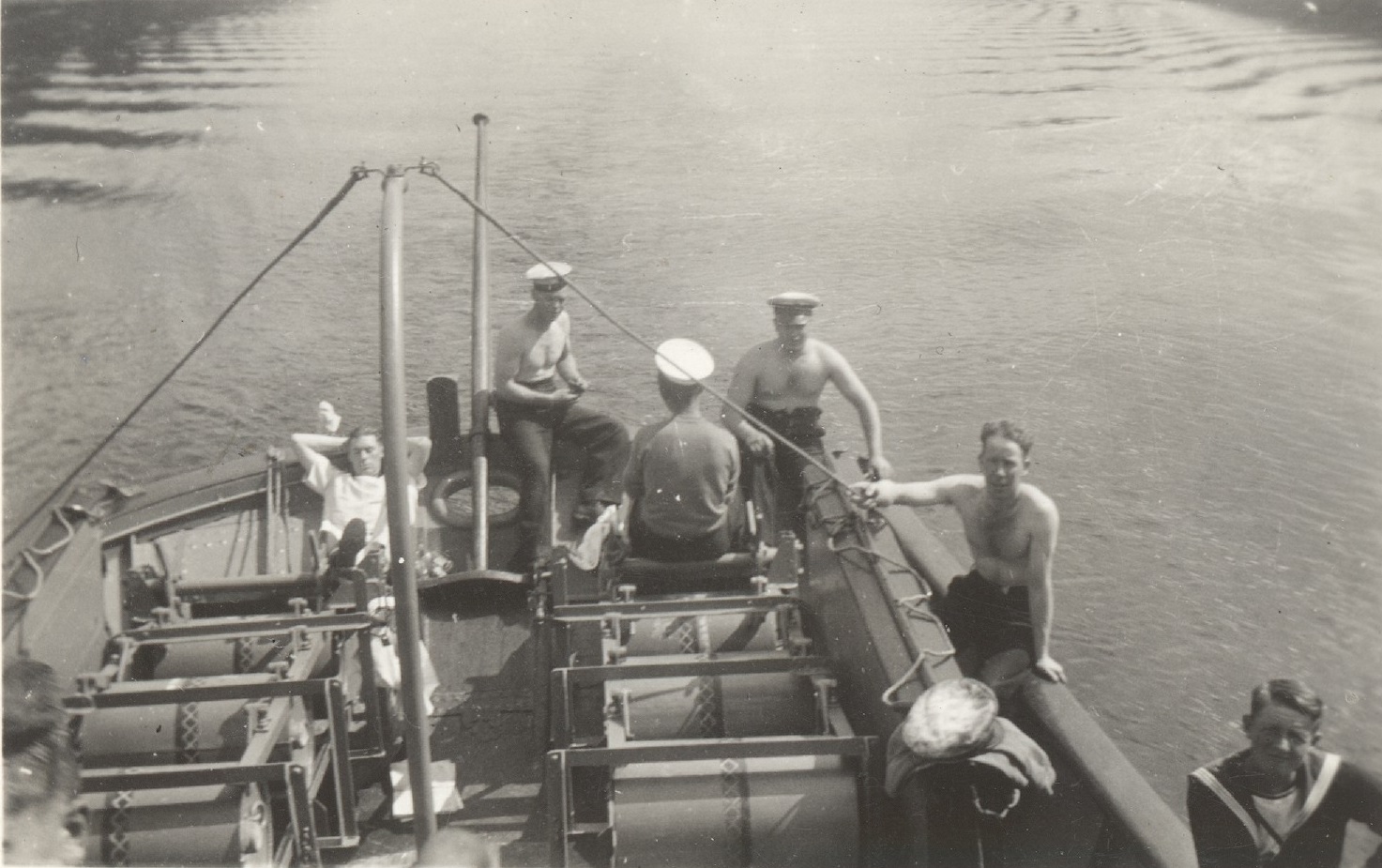 (WD33) Sailors relaxing on the quarterdeck of HMCS WOLF (WD34) Unknown sailor by the depth charge rails of HMCS WOLF (WD35) Ship's boat approaching HMCS WOLF