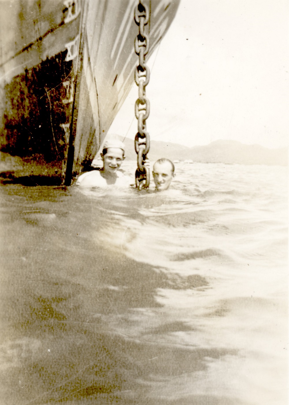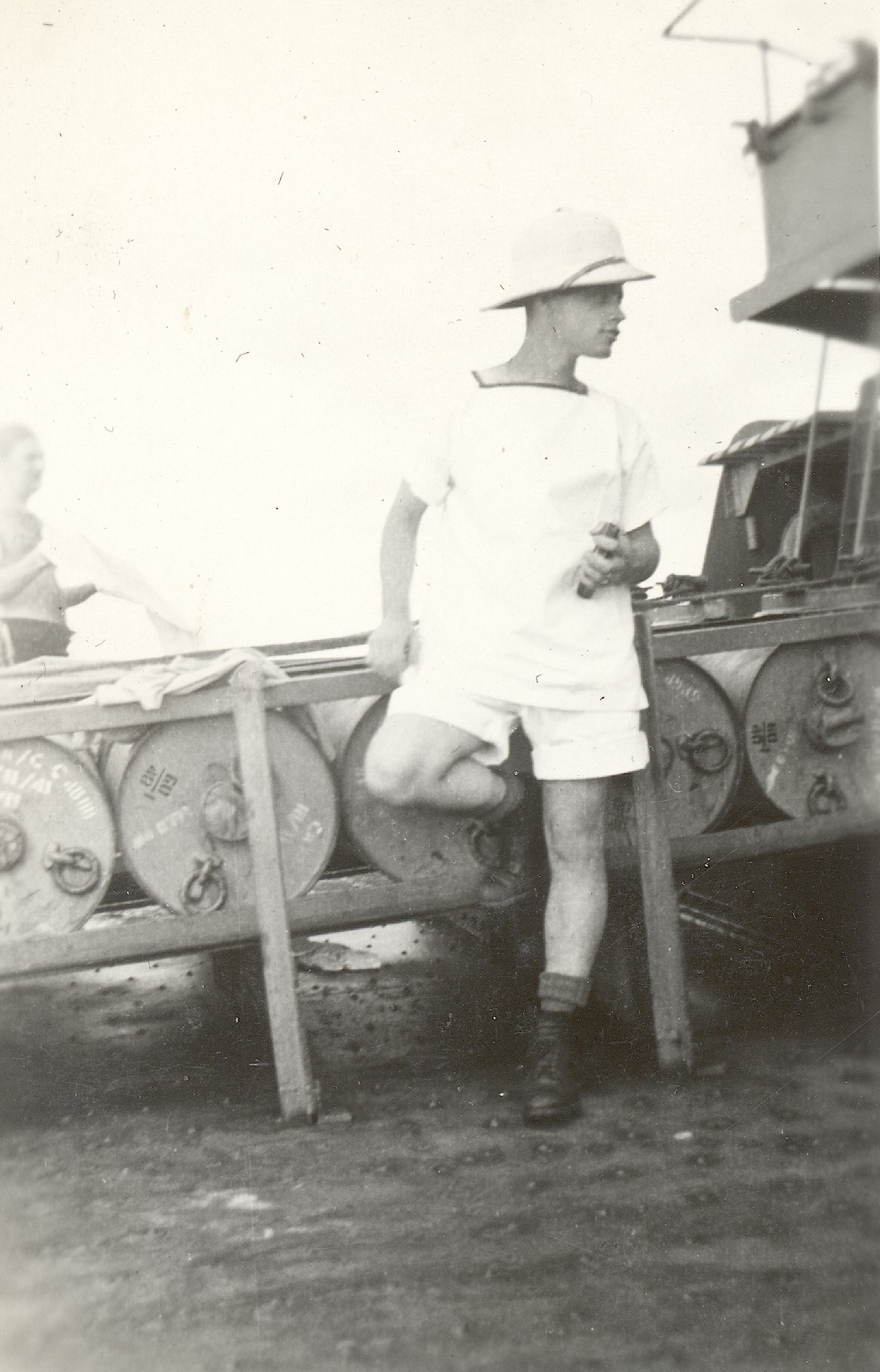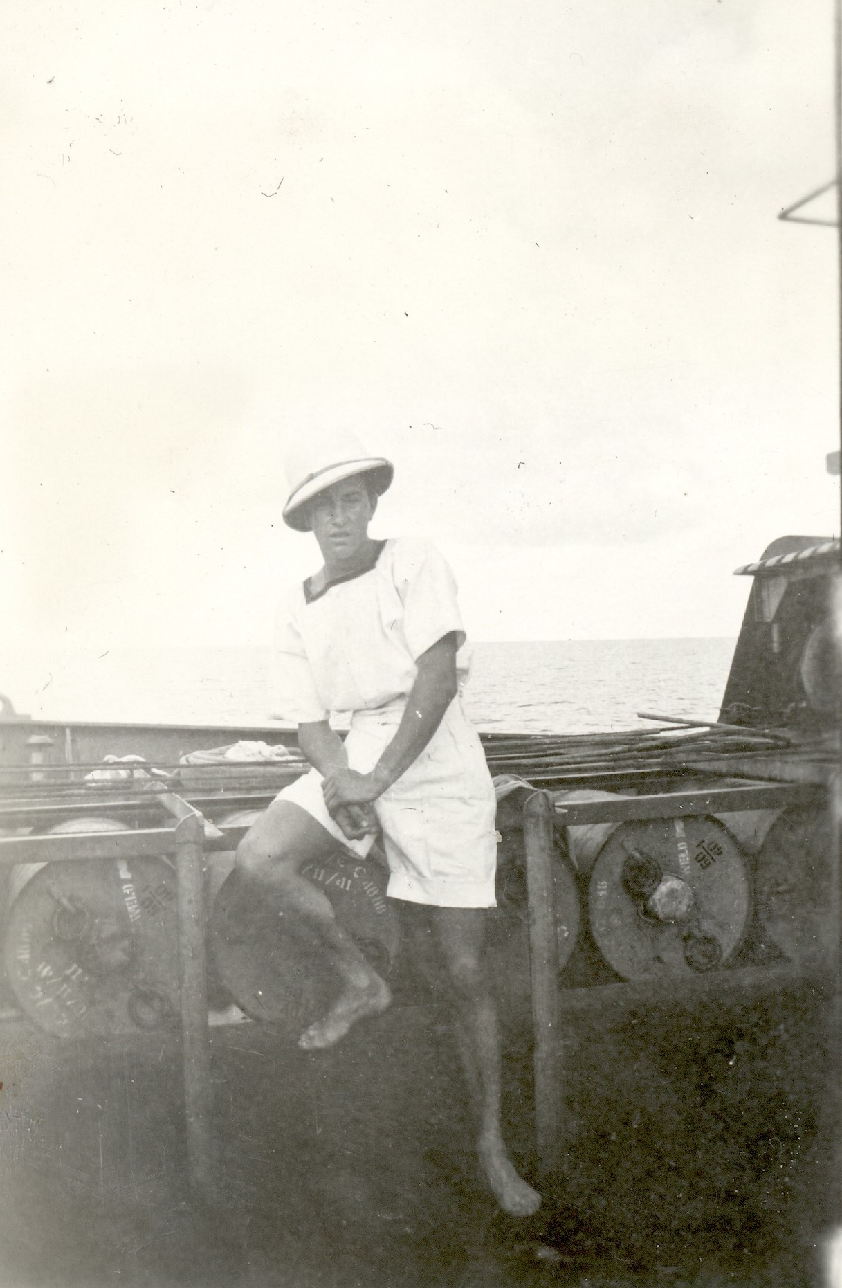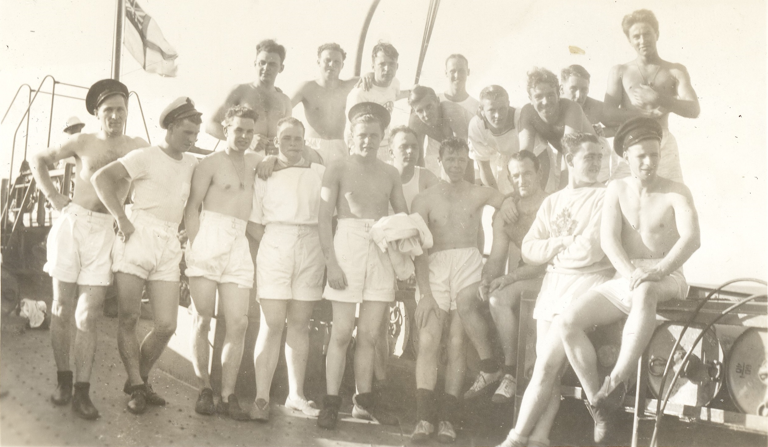 (WD37) Unknown sailors having a swim while HMCS DUNDAS K229 is at anchor off Mexico during her transfer from Esquimalt to Halifax - 1942 (WD38) View HMCS DUNDAS K229, starboard side looking forward, as she heads south on her transit to Halifax - crew now wearing shorts on the upper decks (WD39-WD40) Unknown sailor modeling his tropical whites and wearing the white Pith helmet (WD41) A few of the crew of HMCS DUNDAS K229 enjoying the warm southern weather on the transit to Halifax. Bill Krasikow, front, centre, holding his shirt