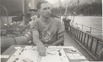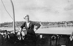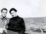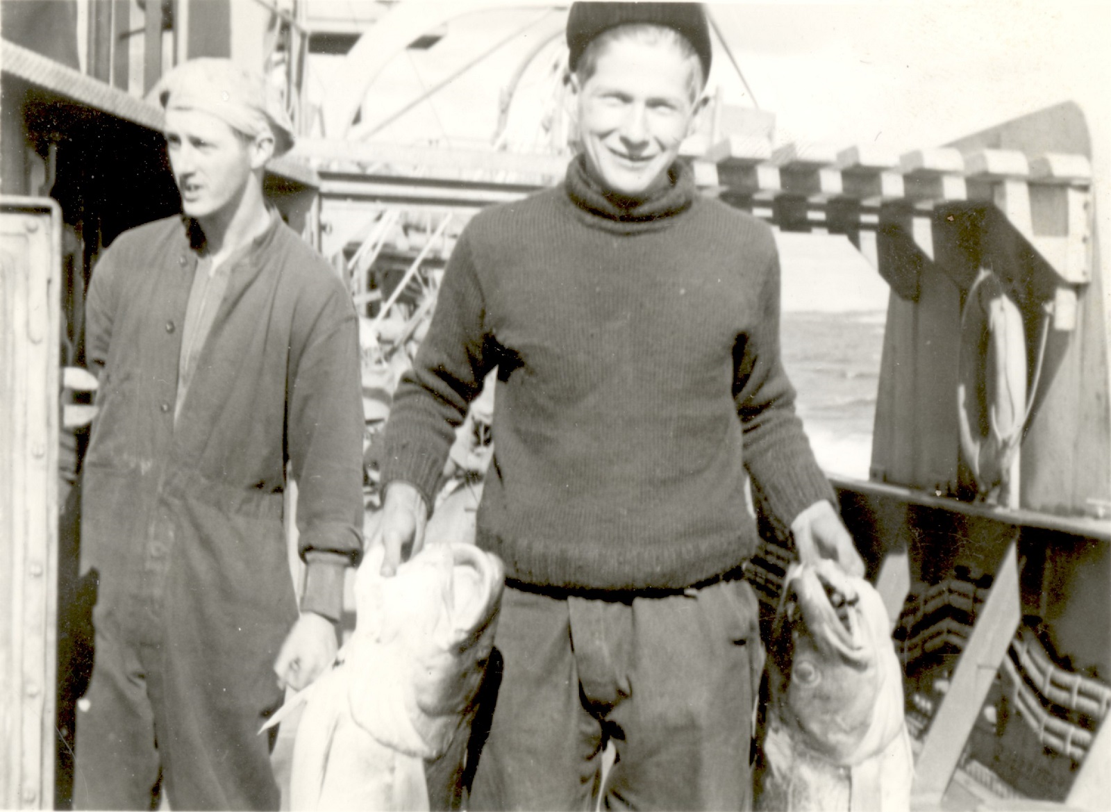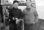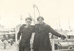 (WD42) Bill Dougall (right) and unknown shipmate with the "Catch of the Day" on board HMCS DUNDAS K229 (WD43) Bill Dougall (left) and unknown shipmate with the "Catch of the Day" on board HMCS DUNDAS K229 (WD44) Unknown sailors on board HMCS DUNDAS K229 posing with the "Catch of the Day"