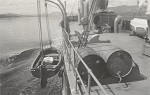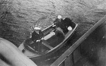 (WD102) Boats crew from HMCS WALLACEBURG heading out to another ship in convoy to pick up a casualty (WD102-WD106) WALLACEBURG'S boat returns and is hoisted up