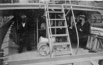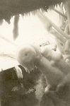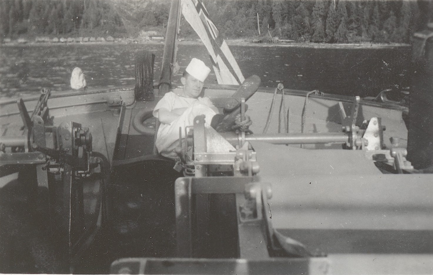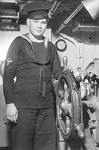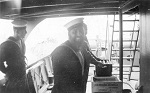 (WD08) Bill Dougall (left) and friend/shipmate somewhere in the USA. Neither sailor has any trade or rank badges so the photo is early in their time in the Navy. (WD09) Unknown sailor by the service bay entrance of A.B. Balderston Ltd., Cole Harbour, Vancouver Island, BC (WD10) Depth charge exploding astern of unknown ship (WD11) Unknown Stoker on in the wheelhouse of an unknown ship