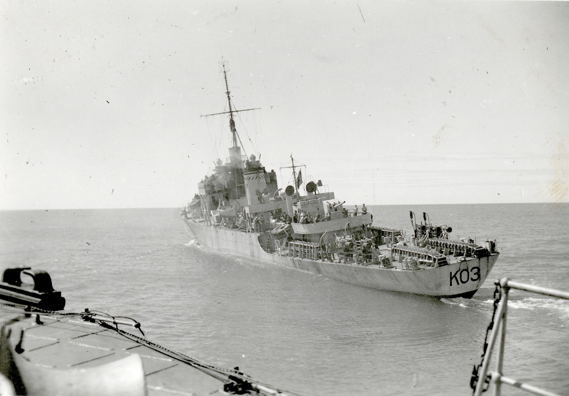 (WD28) HMCS CRUSADER Z13 seen from HMCS WOLF (WD29) Unknown sailors underneath the deck overhang near the quarterdeck of HMCS WOLF (WD30) Lower portion of the gun mount visible on the 2nd deck of HMCS WOLF (WD31) Two sailors, one of them a cook, relaxing on the quarterdeck of HMCS WOLF (WD32) Sailors underneath the deck overhang of HMCS WOLF