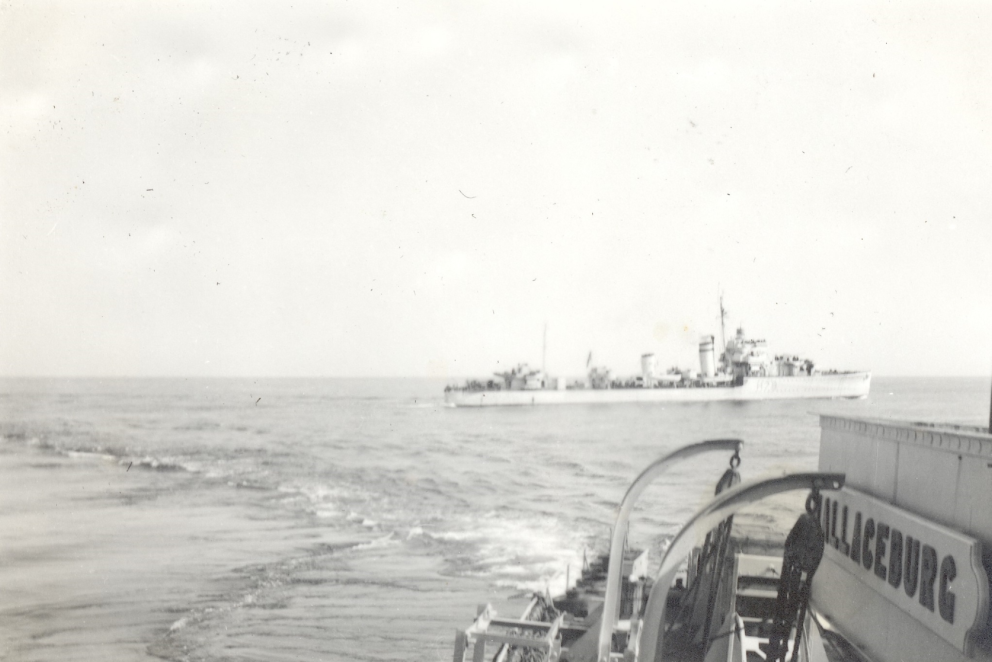 (WD77-WD78) HMCS WALLACEBURG J336 conducting a stern fueling from a tanker in convoy (WD79) HMCS WALLACEBURG J336 conducting a stern fueling from a tanker in convoy (WD80) HMCS WALLACEBURG J336 passing near the stern of a tanker in convoy - possibly after completion of a fueling (WD81) Sailors on WALLACEBURG J336 by the forward gun and below the carley floats