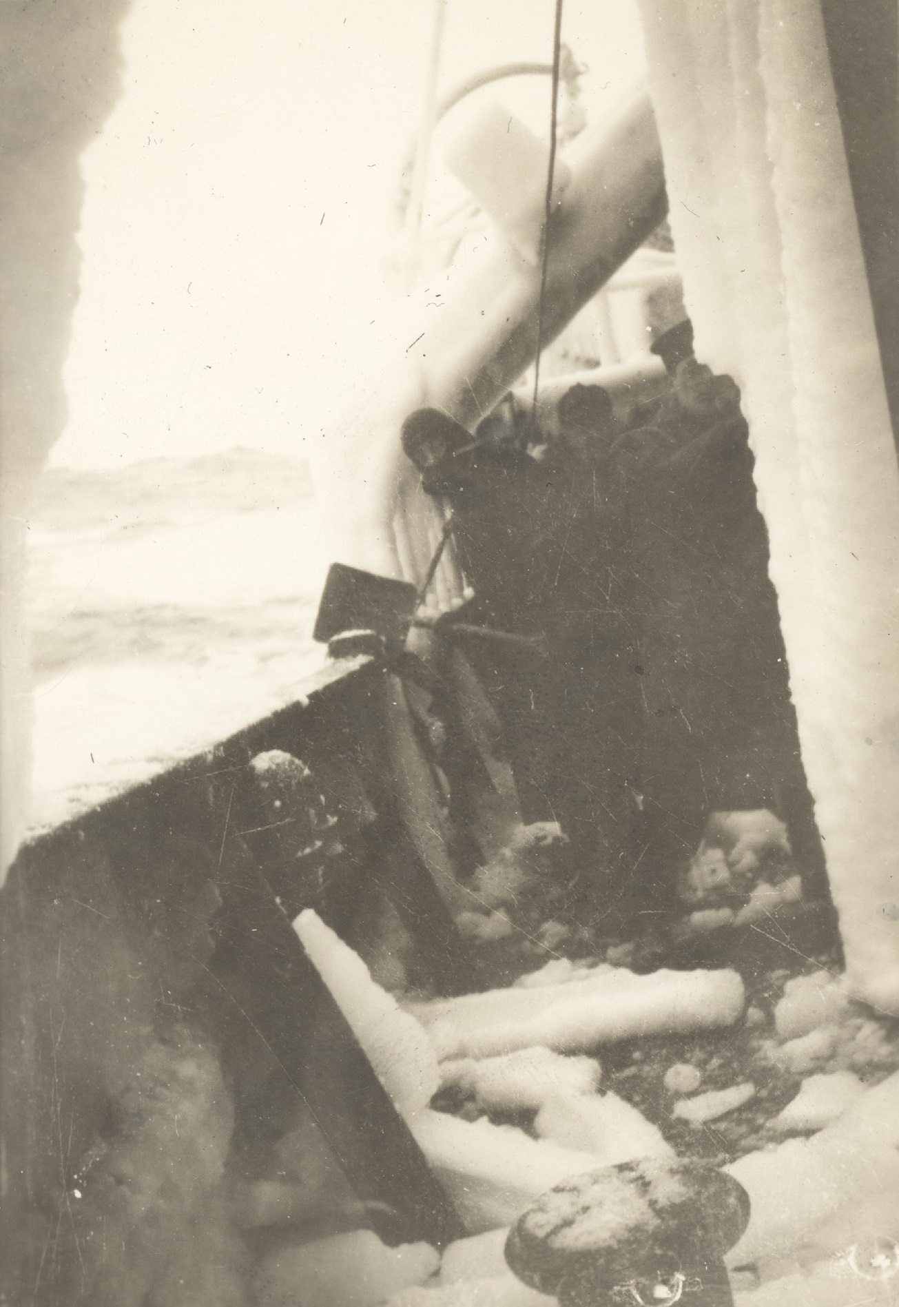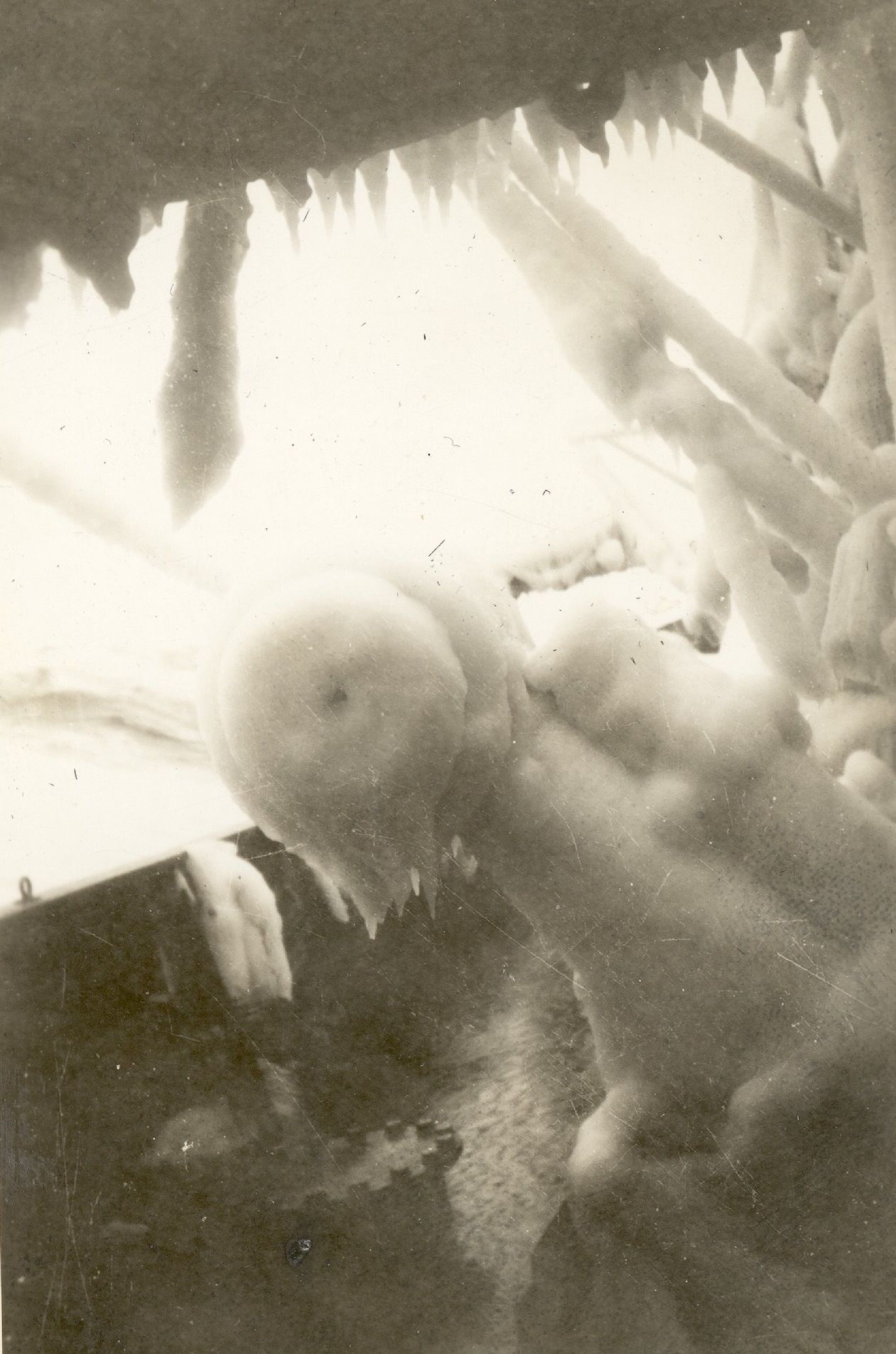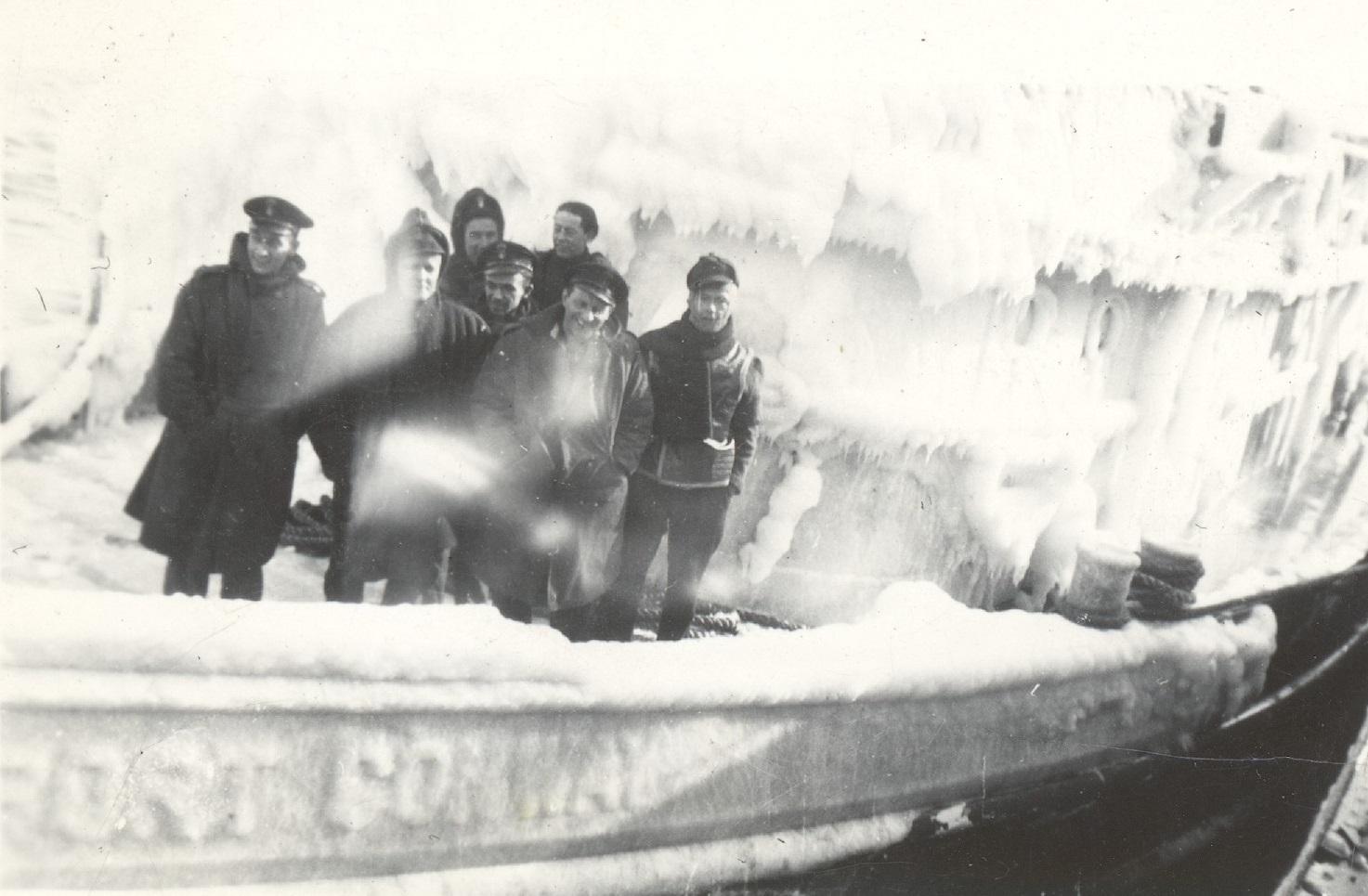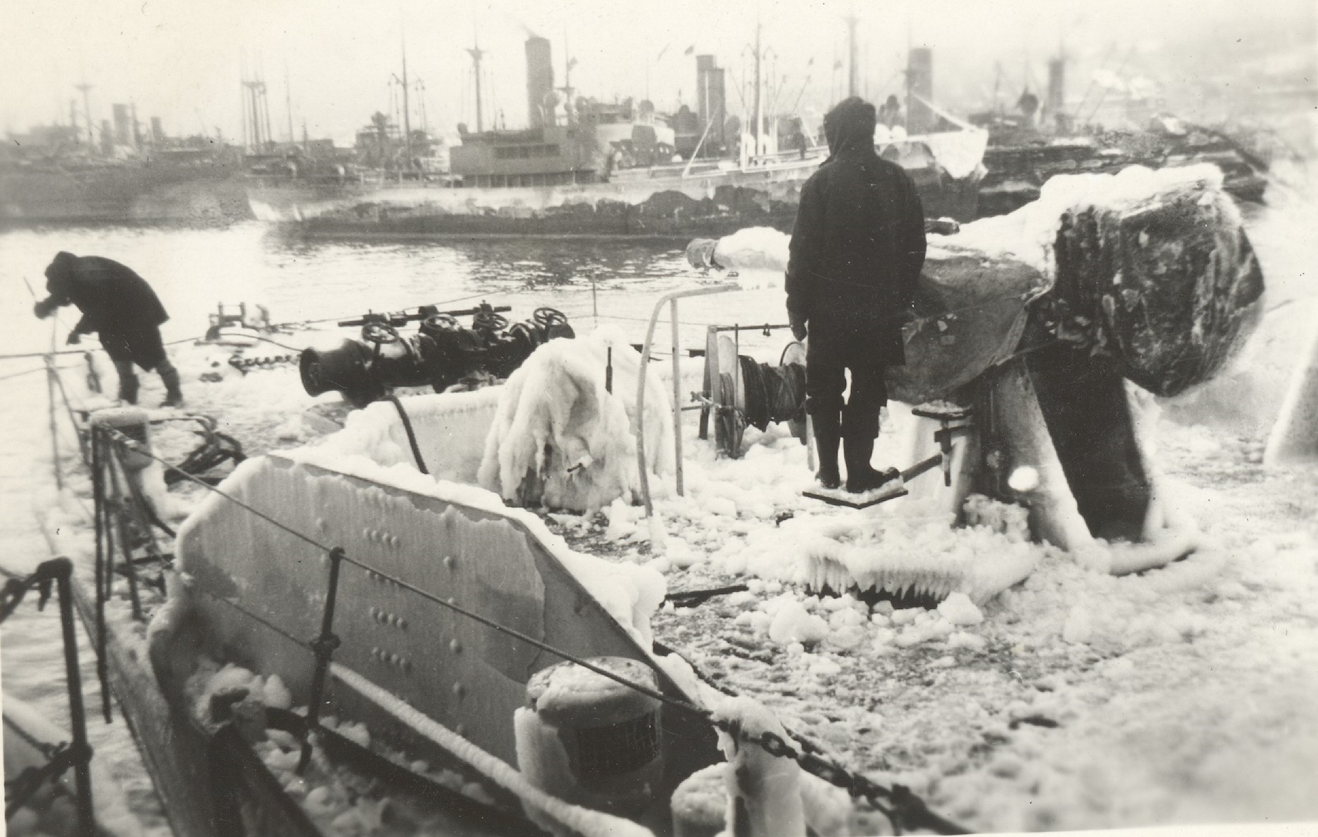 (WD58) Gun deck and fo'c's'le of HMCS DUNDAS K229 ice-up (WD59) Sailors chipping ice on unknown ship. Location believed to be St. John's, Nfld. Photo taken from HMCS DUNDAS K229
