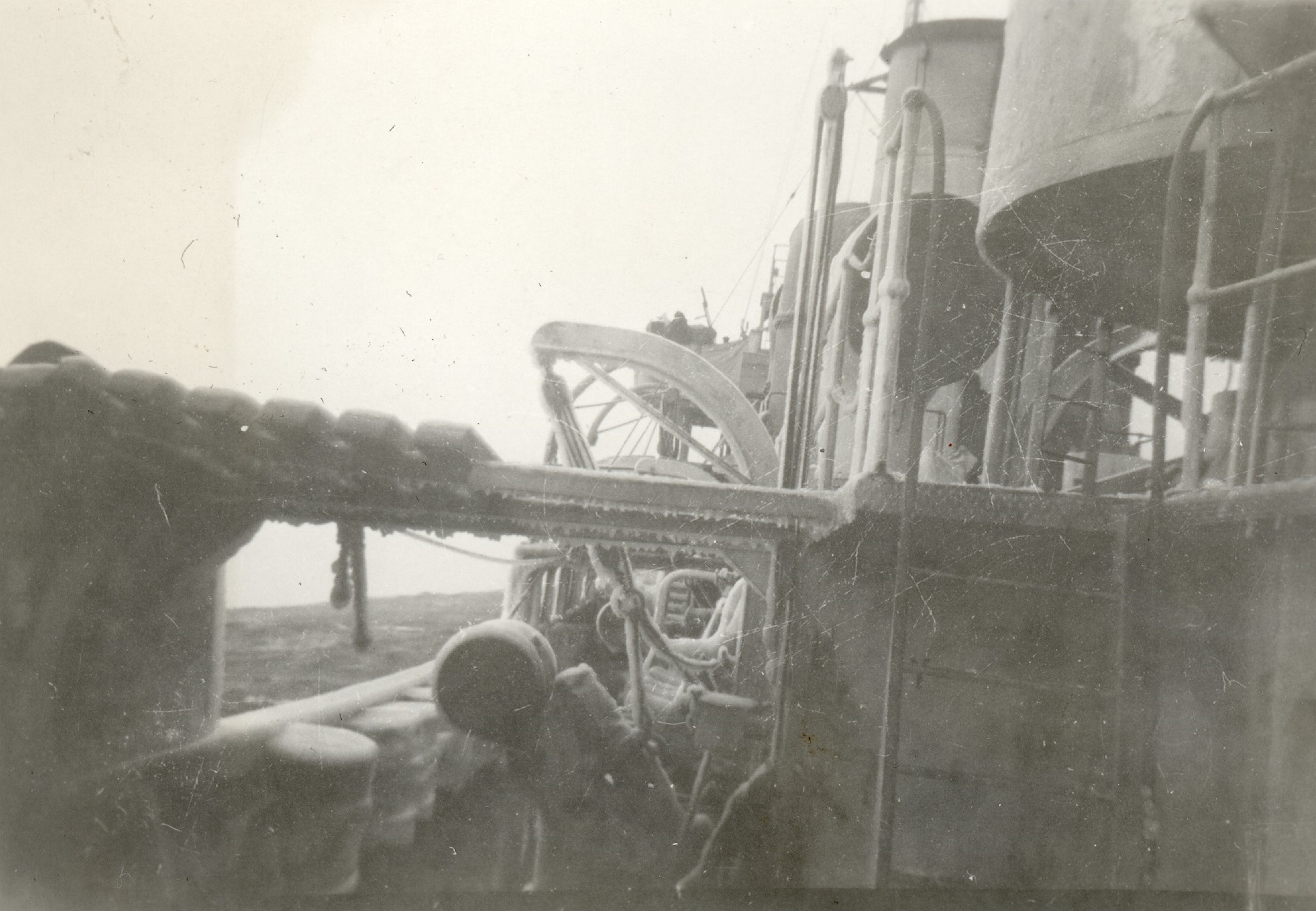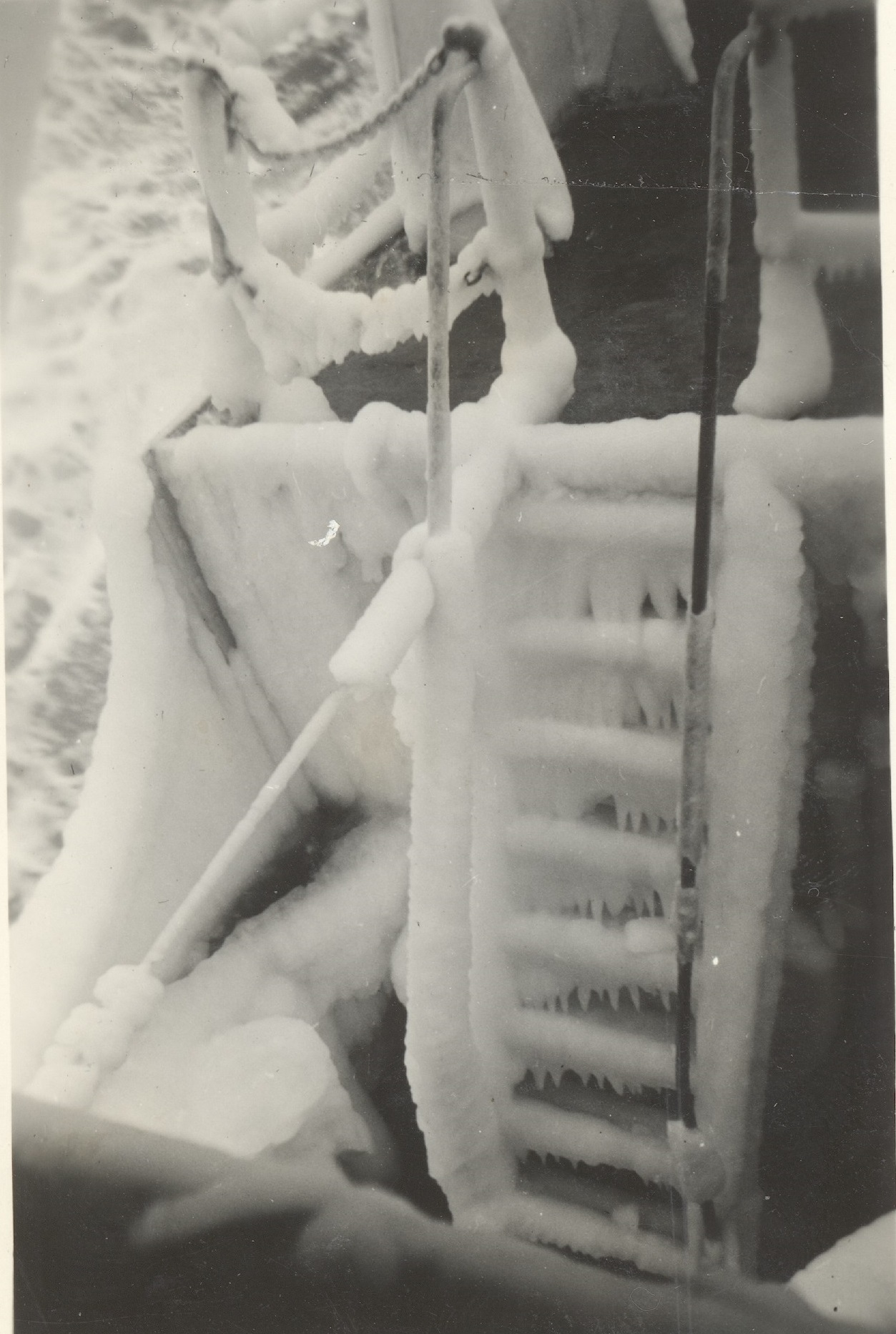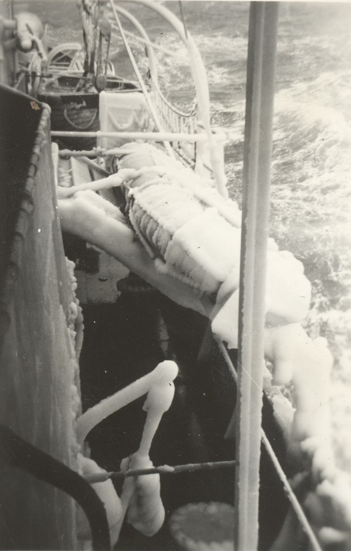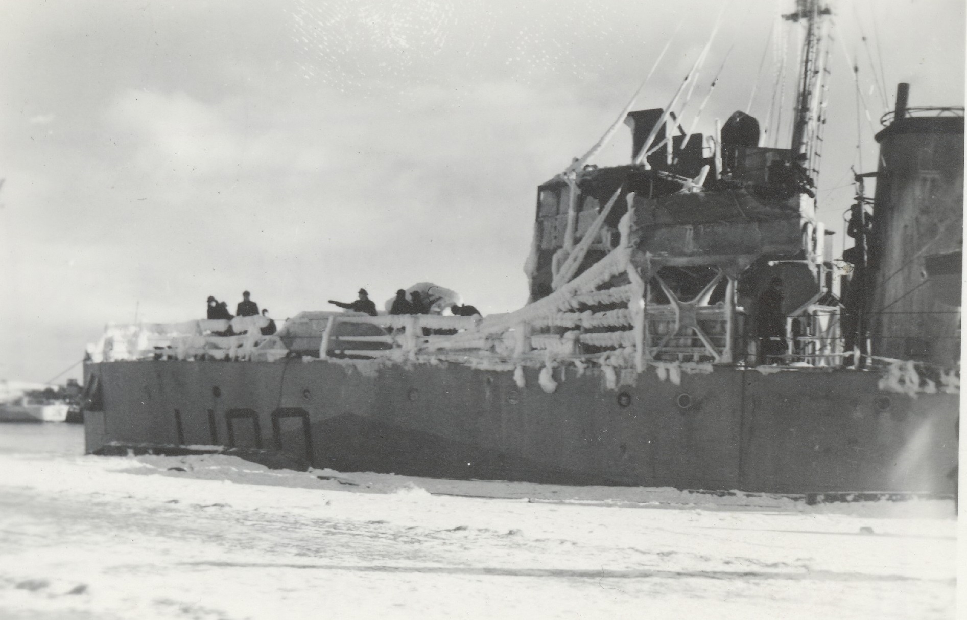 (WD53) HMCS DUNDAS K229 ice up - port side aft looking forward (WD54) Iced Up depth charge thrower on HMCS DUNDAS K229 (WD55) Sailors chipping ice off HMCS DUNDAS K229 (WD56) HMCS DUNDAS K229 iced up - starboard side looking after from the bridge wing (WD57) HMCS DUNDAS K229 - iced up - port side ladder up to the gun deck and fo'c's'le