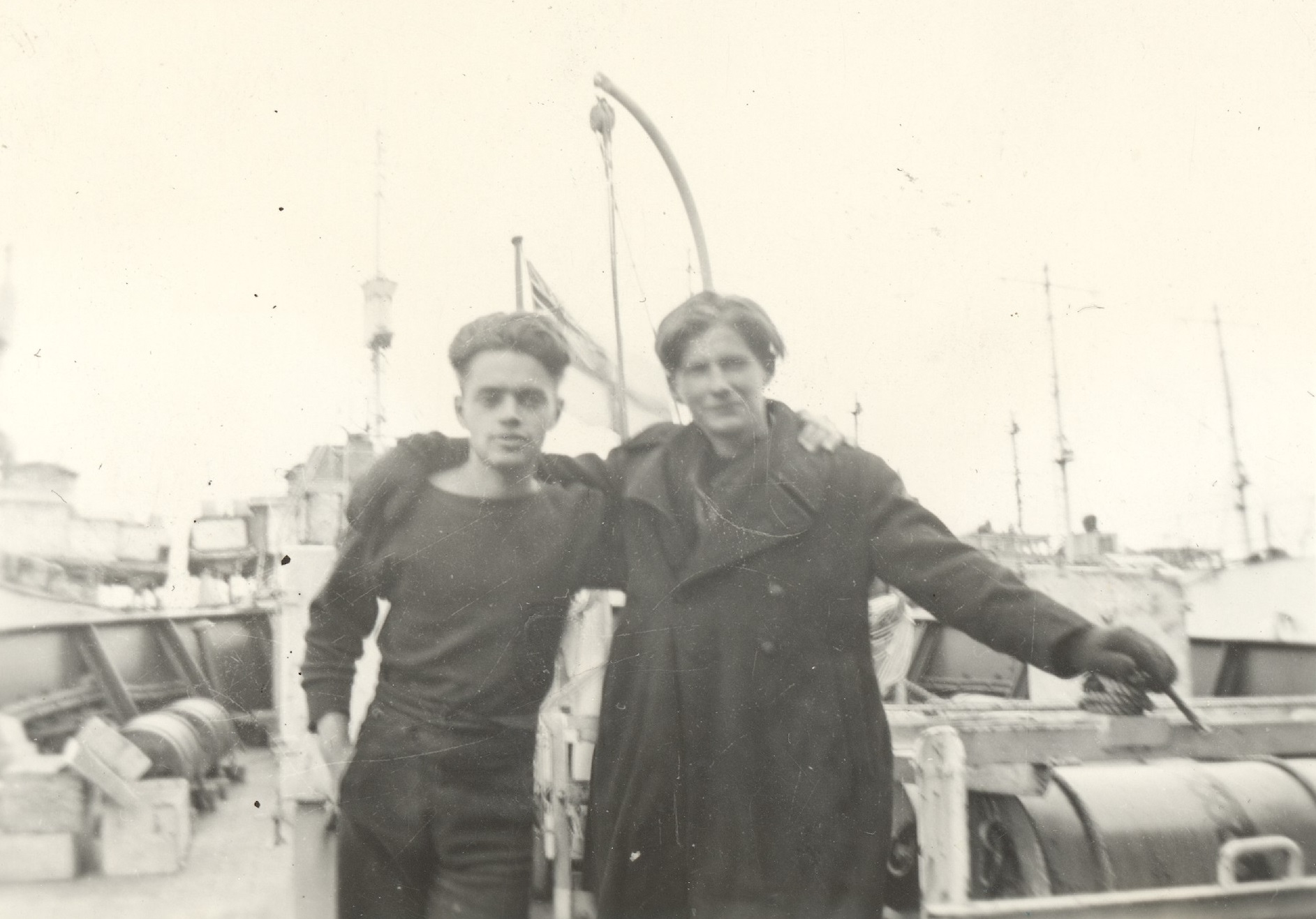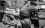 (WD45) Unknown sailor with a bandolier of .50 cal ammo over his shoulders on HMCS DUNDAS K229 (WD46) Bill Dougall (right) with unknown shipmate on HMCS DUNDAS K229 (WD47) Bill Dougall on HMCS DUNDAS K229 (WD48) Bernard Lewis (left) and Bill Dougall on HMCS DUNDAS K229 (WD157) Bill Douglas by one of the port depth charge throwers on HMCS DUNDAS K229