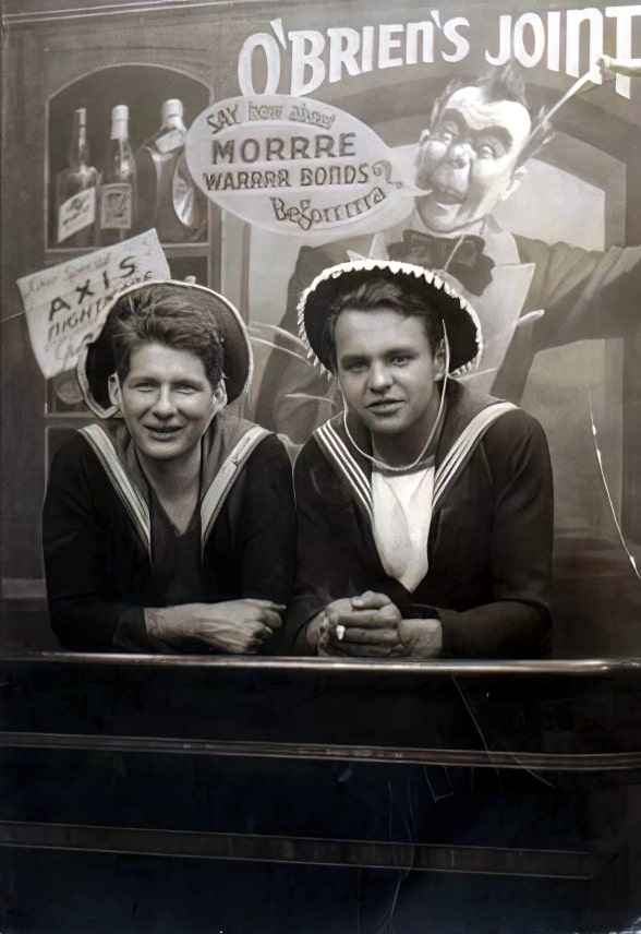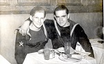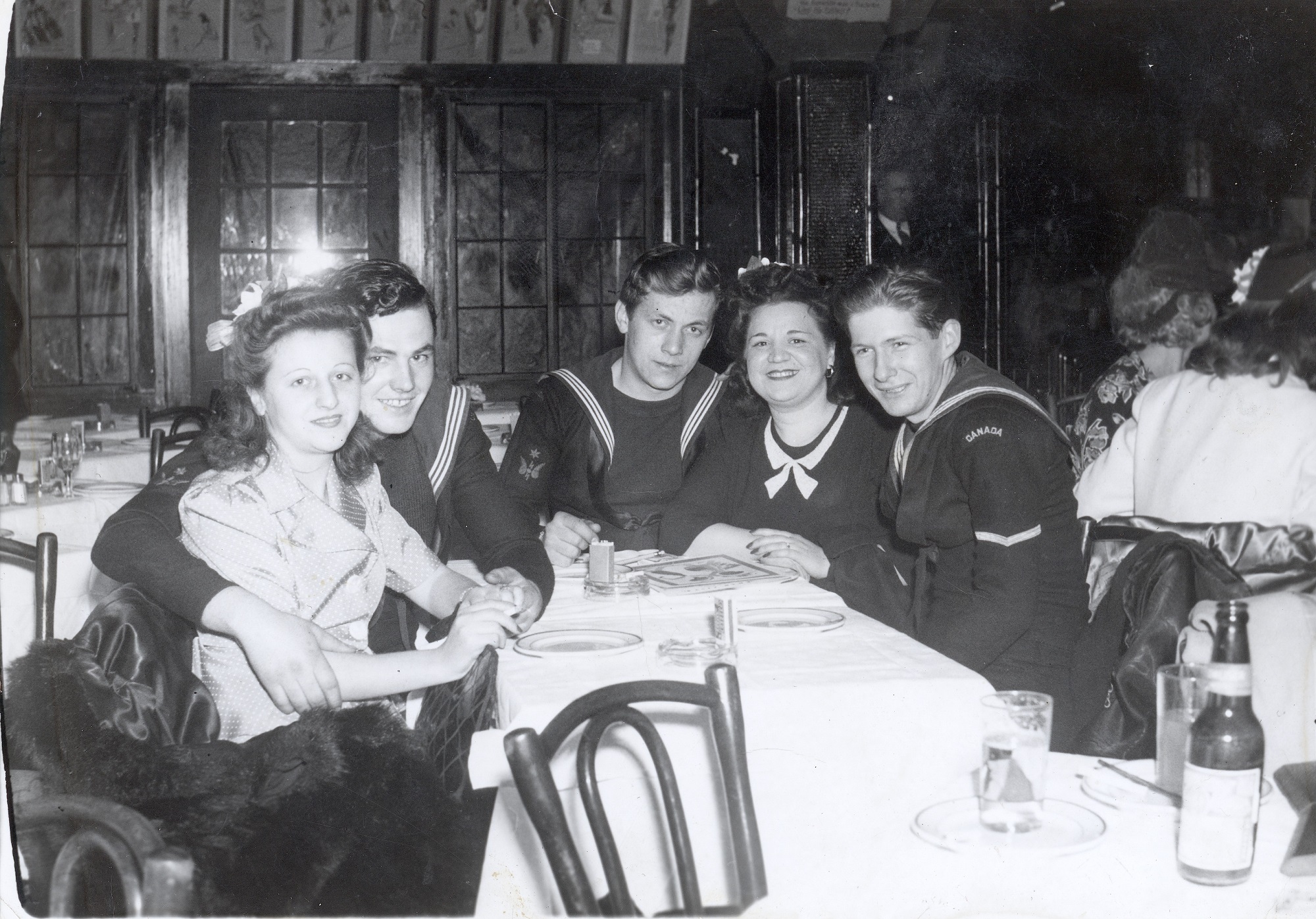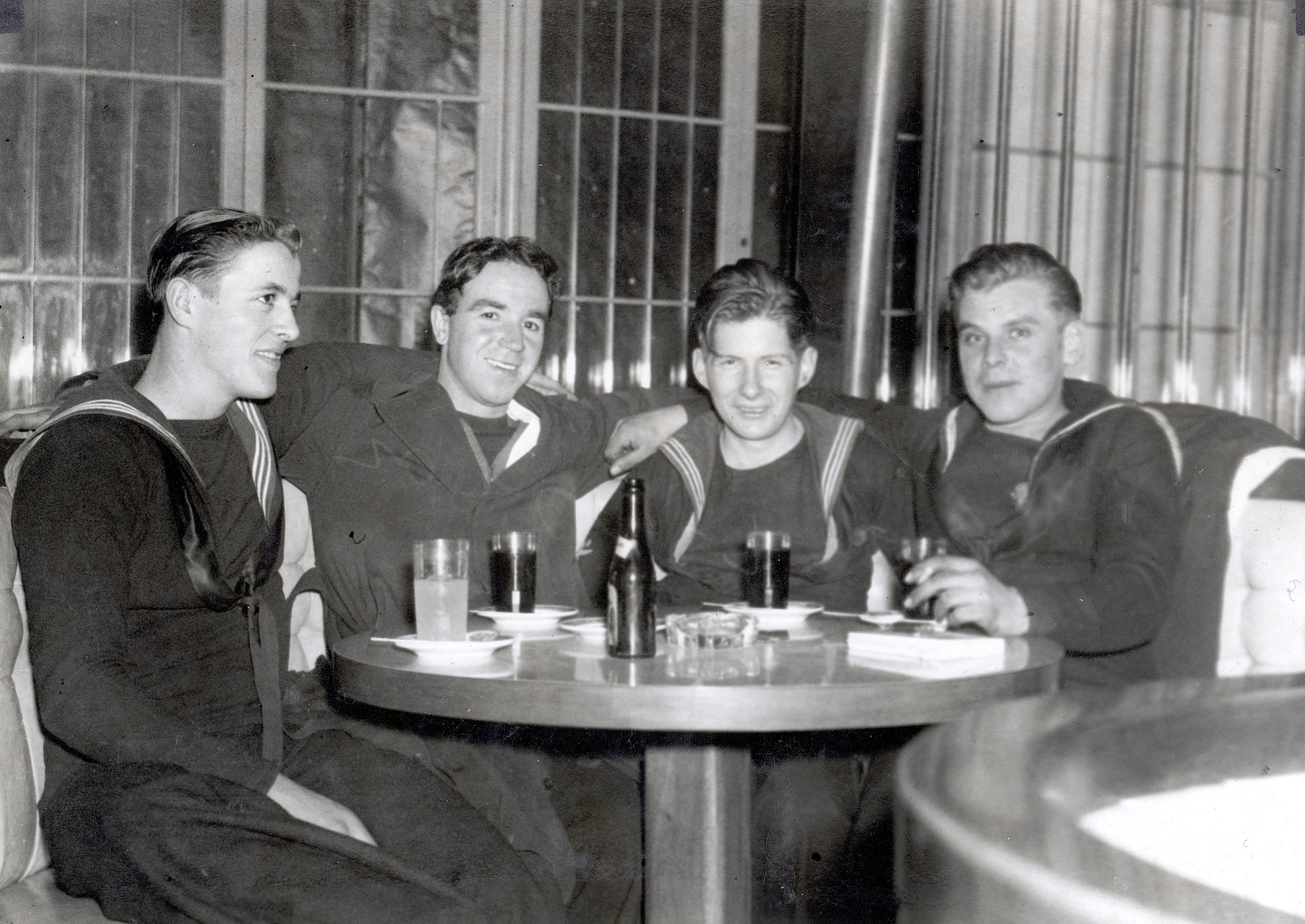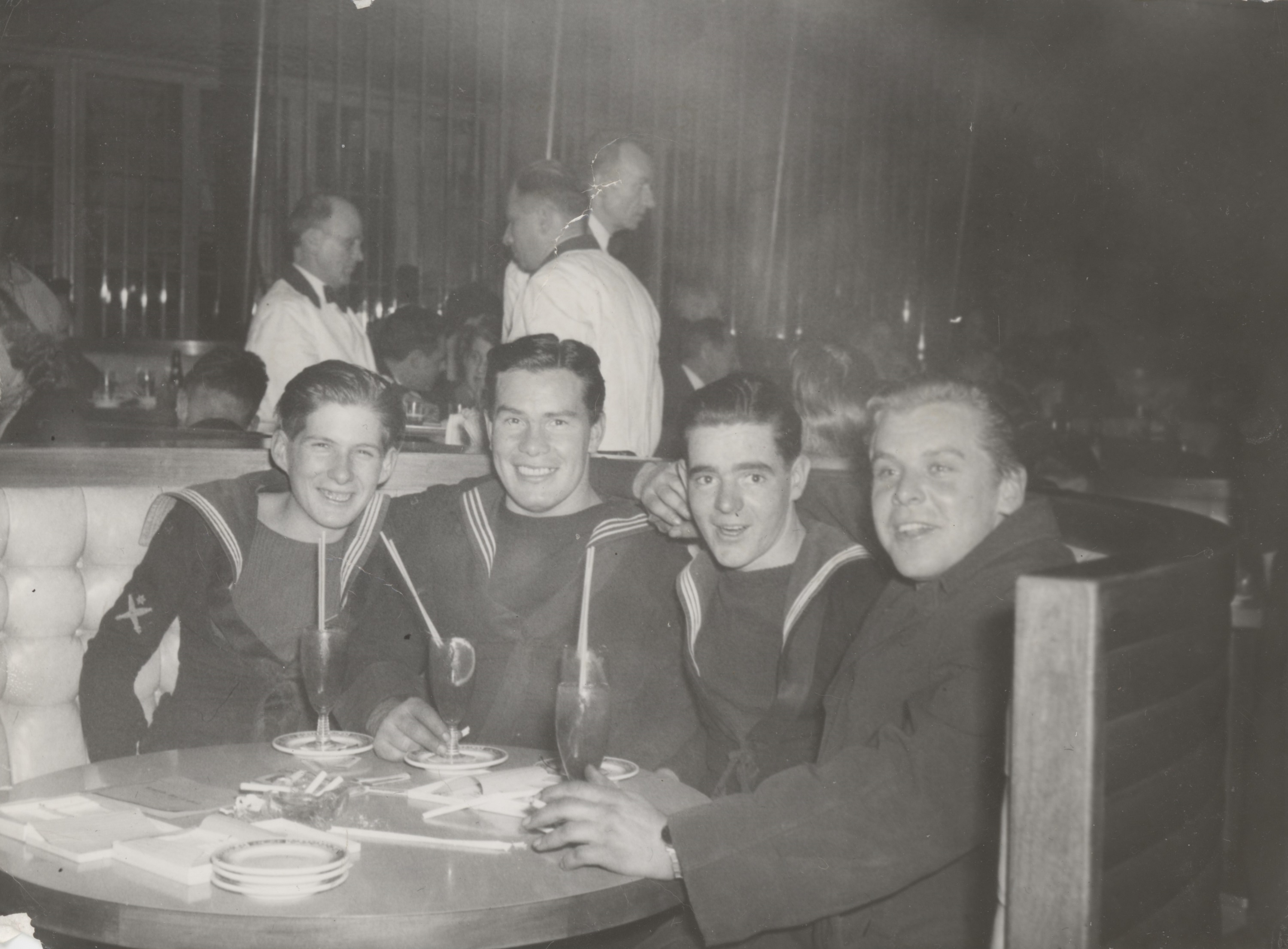 (WD49) DUNDAS shipmates ashore at Rogers Corner in New York City - 1942. L-R: Bill Dougall, Jordan Whitfield, Bernard Lewis and Bill Krasikow (?Krasikaw) - back of photo (WD50) DUNDAS shipmates ashore at Rogers Corner in New York City. L-R: Frank Owens, George Ault, Bill Dougall and Bill Krasikow (?Krasikaw) - back of photo (WD51) DUNDAS shipmates ashore at Leon and Eddie, New York City. Bill Dougall (right) with 2 shipmates and their lady friends (WD52) DUNDAS shipmates ashore - Bill Dougall (left) with Bernard Lewis of Truro, NS