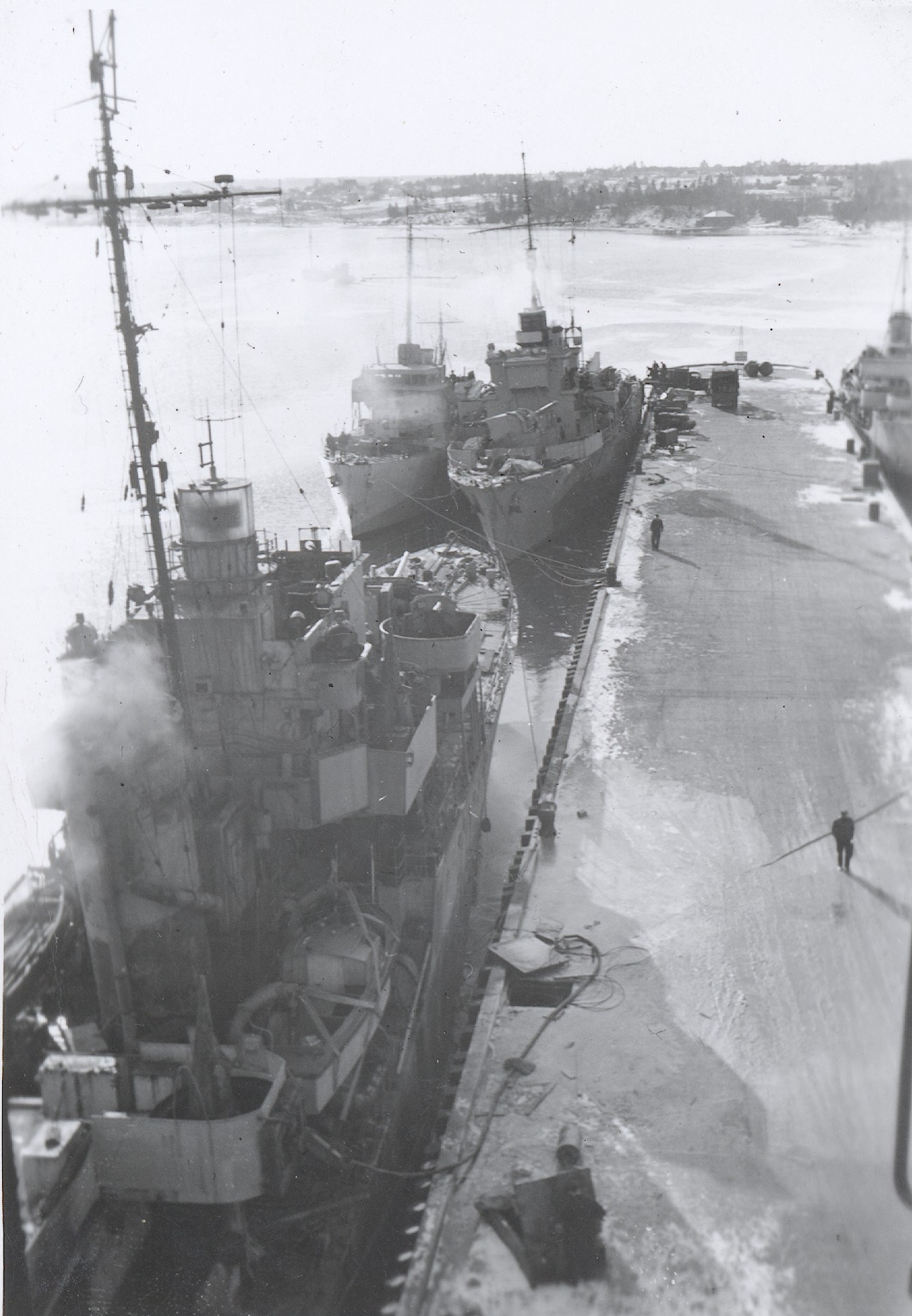 (WD132) Looking down at an unknown warship from the mast / crow's nest of the ship alongside (WD133) Gate Vessels 20 and 21 at Sydney, NS. The stern of HMCS ATHOLL K15 on the right of the photo (WD134) HMCS ATHOLL K15 in refit at Sydney, NS Dec 1944 - Apr 1945. Note that all her weapons have been removed for the refit (WD135) Fairmile Motor Launches berthed ahead of HMCS ATHOLL K15 at Sydney, NS. ML Q111 outboard in the forward group of Fairmiles (WD136) HMCS SAULT STE MARIE J334