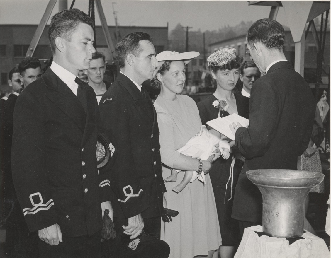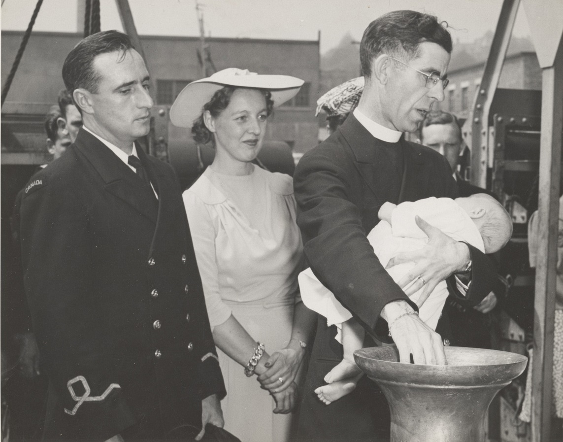 (WD153-WD154) Christening of William Edward, son of SLt and Mrs. Carl B. Brittnell aboard HMCS ST BONIFACE. Godparents Lt John De La Fosse Frewer, CO, HMCS ST BONIFACE and Mrs. H.F. Richardson, of Larder Lake, Ont.