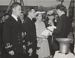 (WD95) LCdr Robert A.S. MacNeil, RCNVR, CO welcomes Gail Patrick aboard HMCS WALLACEBURG - RCN Neg # HN1110 (WD96) Gail Patrick and LCdr MacNeil hold the 6th Victory Loan pennant while a signalman prepares to hoist it. The 6th Victory Loan drive commenced Apr 1944 - RCN Neg # HN1109 (WD97) Gail Patrick visits the seaman's mess deck - RCN Neg # HN1108 (WD98) Gail Patrick signs the ship's guest book - RCN Neg # HN1112 (WD99) Gail Patrick with 2 unknown officers on the bridge of HMCS WALLACEBURG - RCN Neg # HN1113