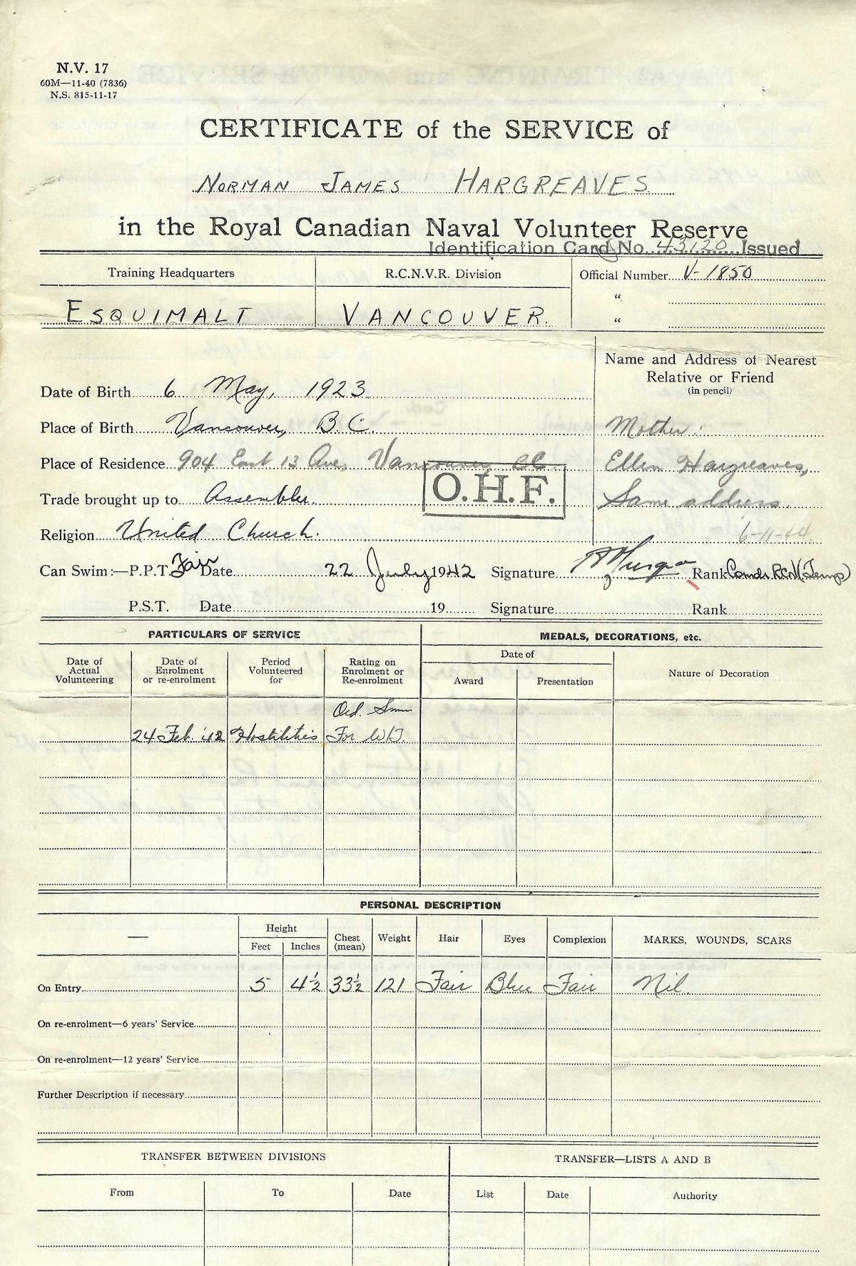 HMCS DISCOVERY - Enlisted 24 Feb 1942 as an OS for Wireless Telegraph training.. Commenced Active Service 16 Mar 1942