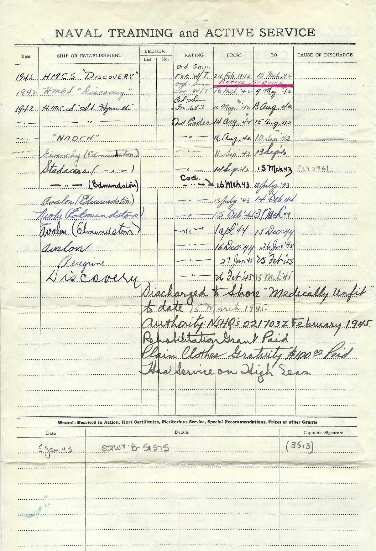 HMCS DISCOVERY - Drafted to Discovery 26 Feb 1945.  Medically discharged 15 Mar 1945