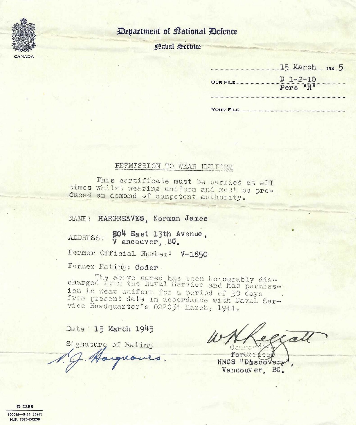 (NH01) Portrait of Coder Norman Hargreaves  (NH02-NH04) Certificate of Service - pages 1-3)  (NH05) Permission to wear uniform for up to 30 days from date of discharge.