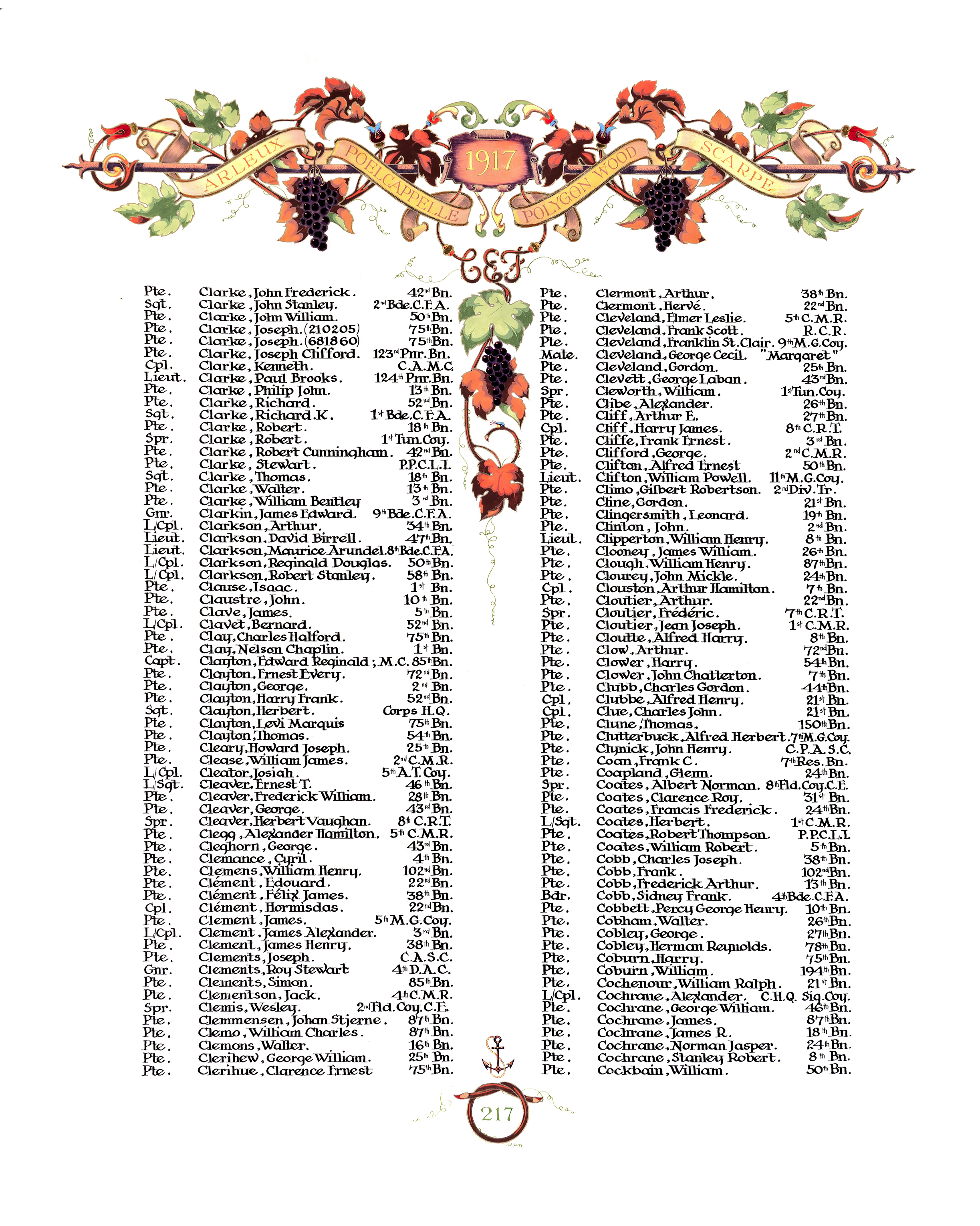Ships served in: * Listed as an Acting Mate (seniority 01 Jul 1915) (Navy List Sep 1916) * Recorded on the logs of Depot Ship DIANA 01 Jul 1915 as Mate, RNCVR, add'l HMCS MARGARET - Appointed to MARGARET as a Mate, RNCVR (Navy List Jan 1917). Appointed to MARGARET 29 Oct 1917 as a Boatswain, RNCVR (seniority 23 Jul 1915) (Navy List Dec 1917)