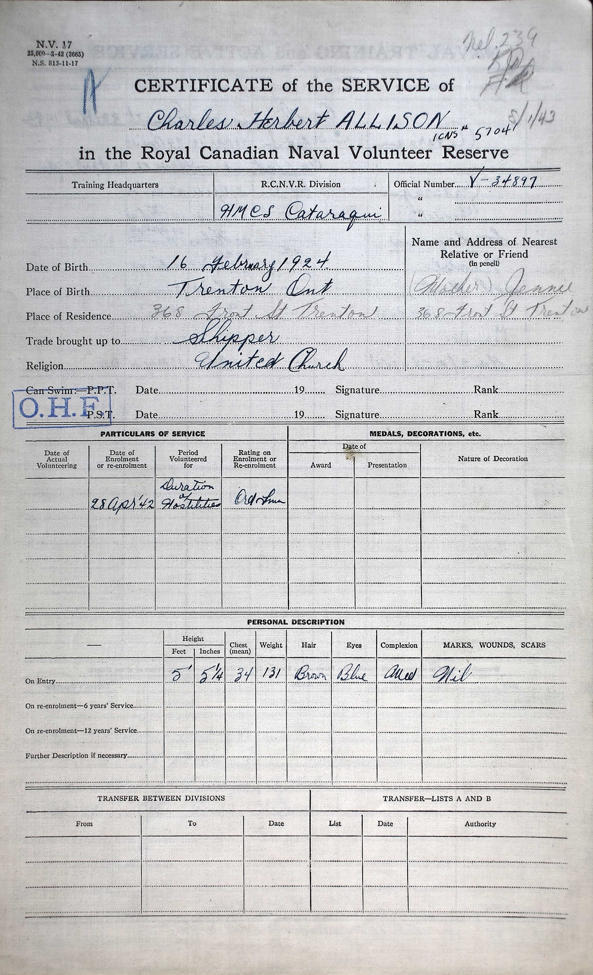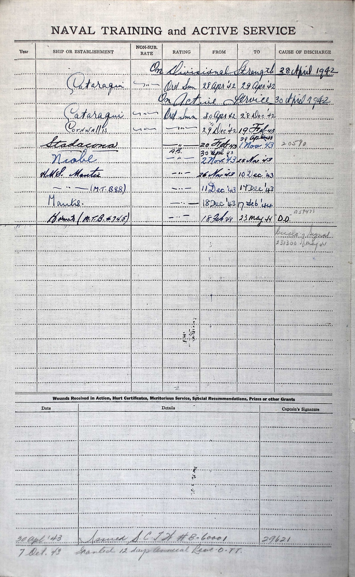 Ships served in: HMCS CATARAQUI - Enlisted 28 Apr 1942. Commenced Active Service 30 Apr 1942 HMS MANTIS (Royal Navy Coastal Forces Base, Lowestoft, Suffolk, England) - Served in MANTIS 26 Nov 1943 - 10 Dec 1943 as an AB, RCNVR HMMTB B88 - Served in B88 11 Dec 1943 - 17 Dec 1943 as an AB, RCNVR HMS MANTIS - Served in MANTIS 18 Dec 1943 - 17 Feb 1944 as an AB, RCNVR MTB 745 - Drafted to MTB 745 18 Feb 1944 as an AB, RCNVR MTB 726 - Date drafted to MTB 726 unknown