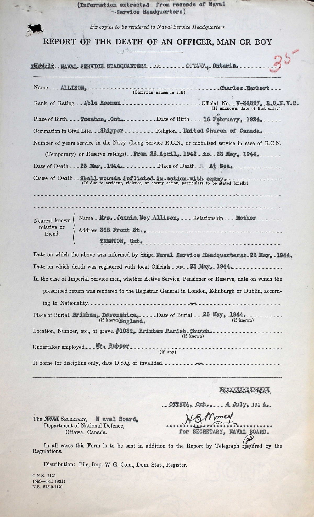 ALLISON, Charles Herbert AB, V34987, RCNVR killed - 23 May 1944, MTB 726 - Son of Herbert and Jenney May Allison, of Trenton, ON.