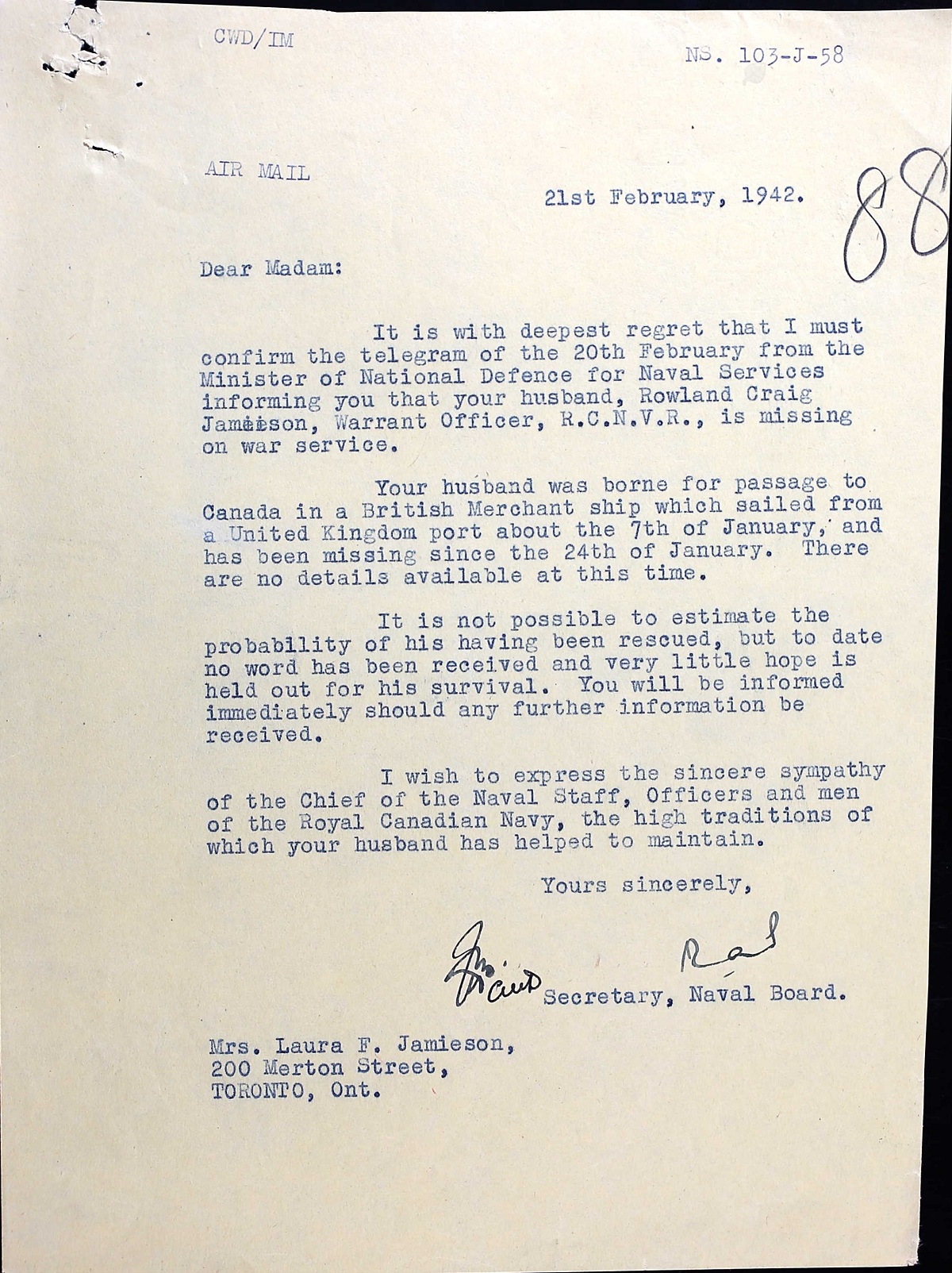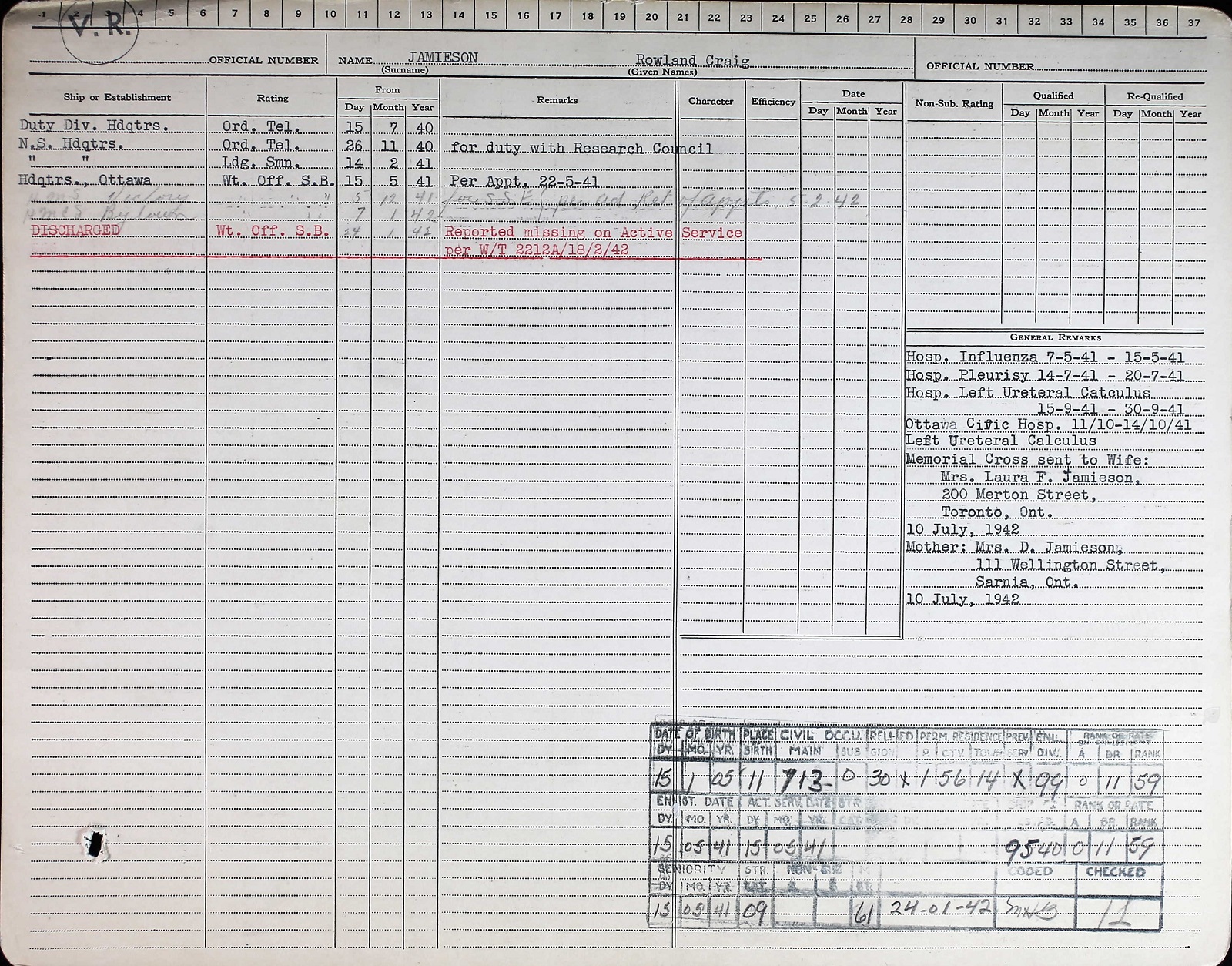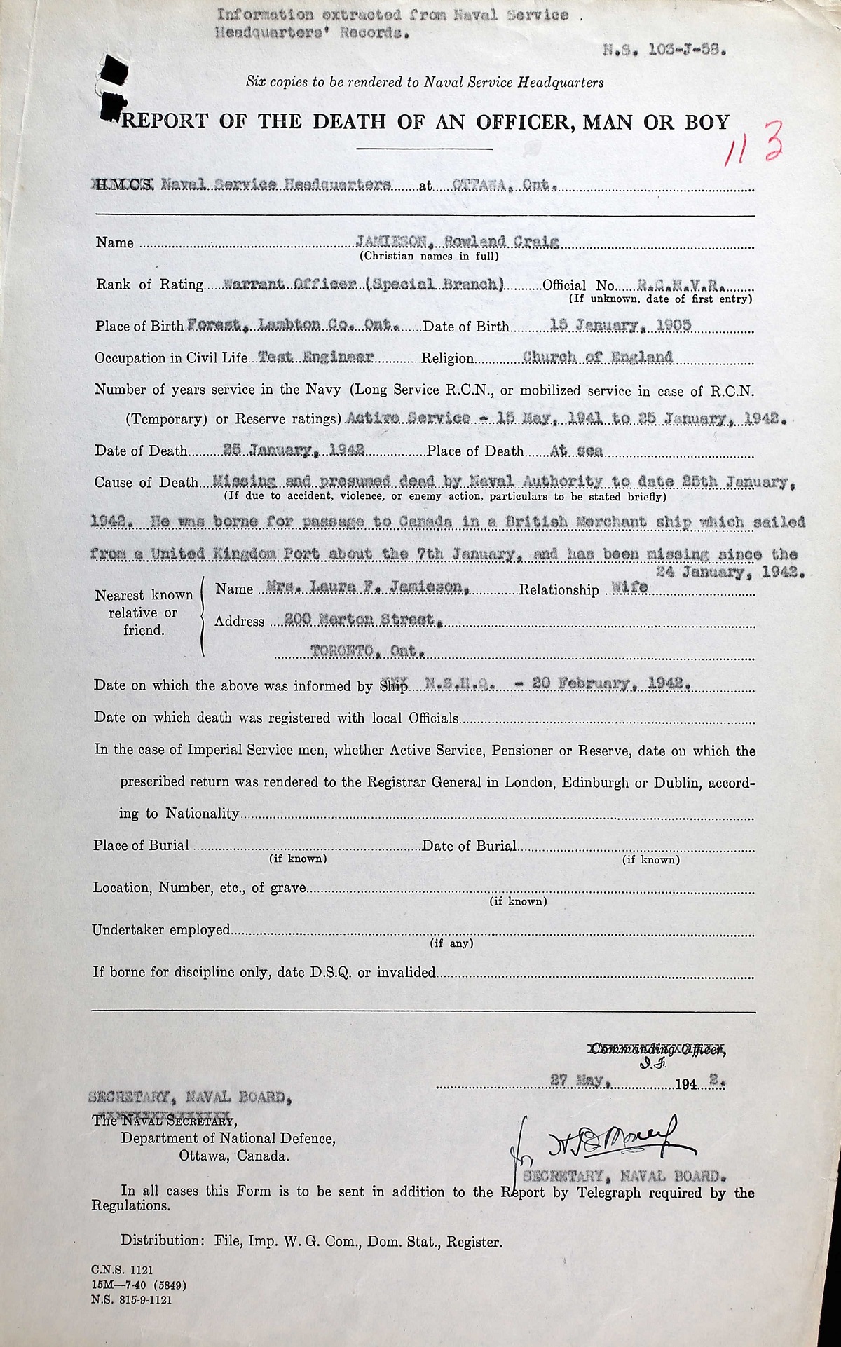 Ships served in: TORONTO DIVISION RCNVR - Enlisted 15 Jul 1940 as an Ordinary Telegraphist. Commenced Active Service 15 Jul 1940 NAVAL SERVICE HEADQUARTERS OTTAWA - Served at NSHQ for duty with Research Council 26 Nov 1940 - 14 May 1941 as an O/Tel and LS (RDF), RCNVR * Appointed Warrant Officer (Special Branch) 15 Jun 1941 HMS VICTORY - Served in VICTORY for S.S.E. 05 Dec 1941 - 06 Jan 1942 as a Wt (SB), RCNVR HMCS BYTOWN - Appointed to BYTOWN 07 Jan 1942 as a Wt (SB), RCNVR SS RINGSTAD - Wt Jamieson died when the ship he was passenger on from the UK to Canada for his appointment to HMCS BYTOWN, the SS RINGSTAD, was torpedoed and sunk by U-333