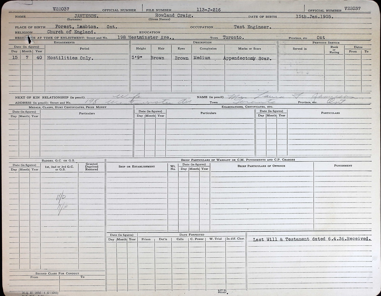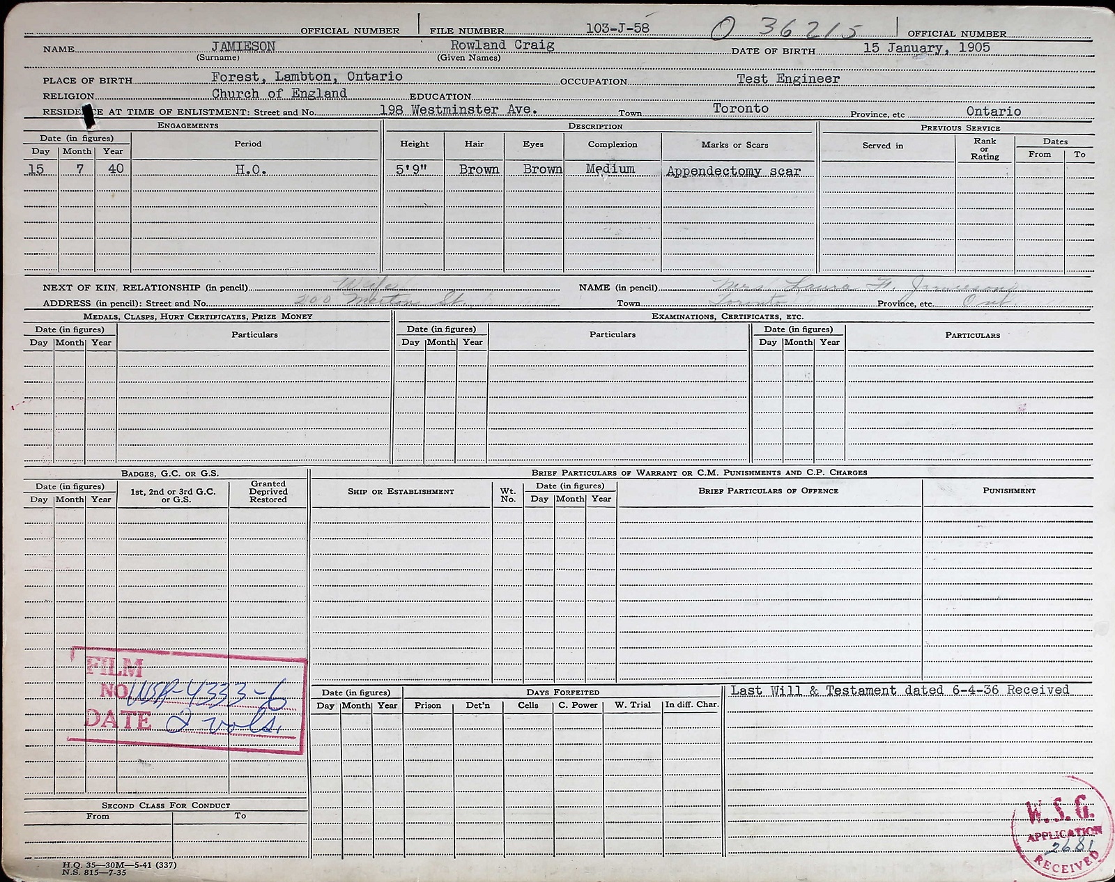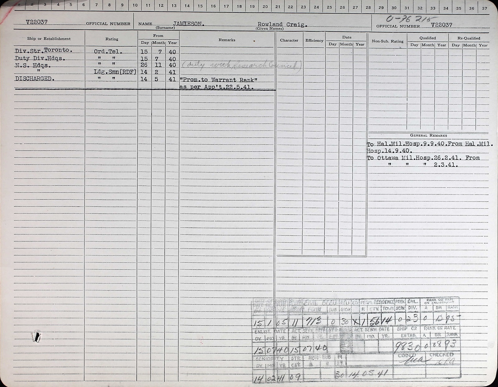 Ships served in: TORONTO DIVISION RCNVR - Enlisted 15 Jul 1940 as an Ordinary Telegraphist. Commenced Active Service 15 Jul 1940 NAVAL SERVICE HEADQUARTERS OTTAWA - Served at NSHQ for duty with Research Council 26 Nov 1940 - 14 May 1941 as an O/Tel and LS (RDF), RCNVR * Appointed Warrant Officer (Special Branch) 15 Jun 1941 HMS VICTORY - Served in VICTORY for S.S.E. 05 Dec 1941 - 06 Jan 1942 as a Wt (SB), RCNVR HMCS BYTOWN - Appointed to BYTOWN 07 Jan 1942 as a Wt (SB), RCNVR SS RINGSTAD - Wt Jamieson died when the ship he was passenger on from the UK to Canada for his appointment to HMCS BYTOWN, the SS RINGSTAD, was torpedoed and sunk by U-333