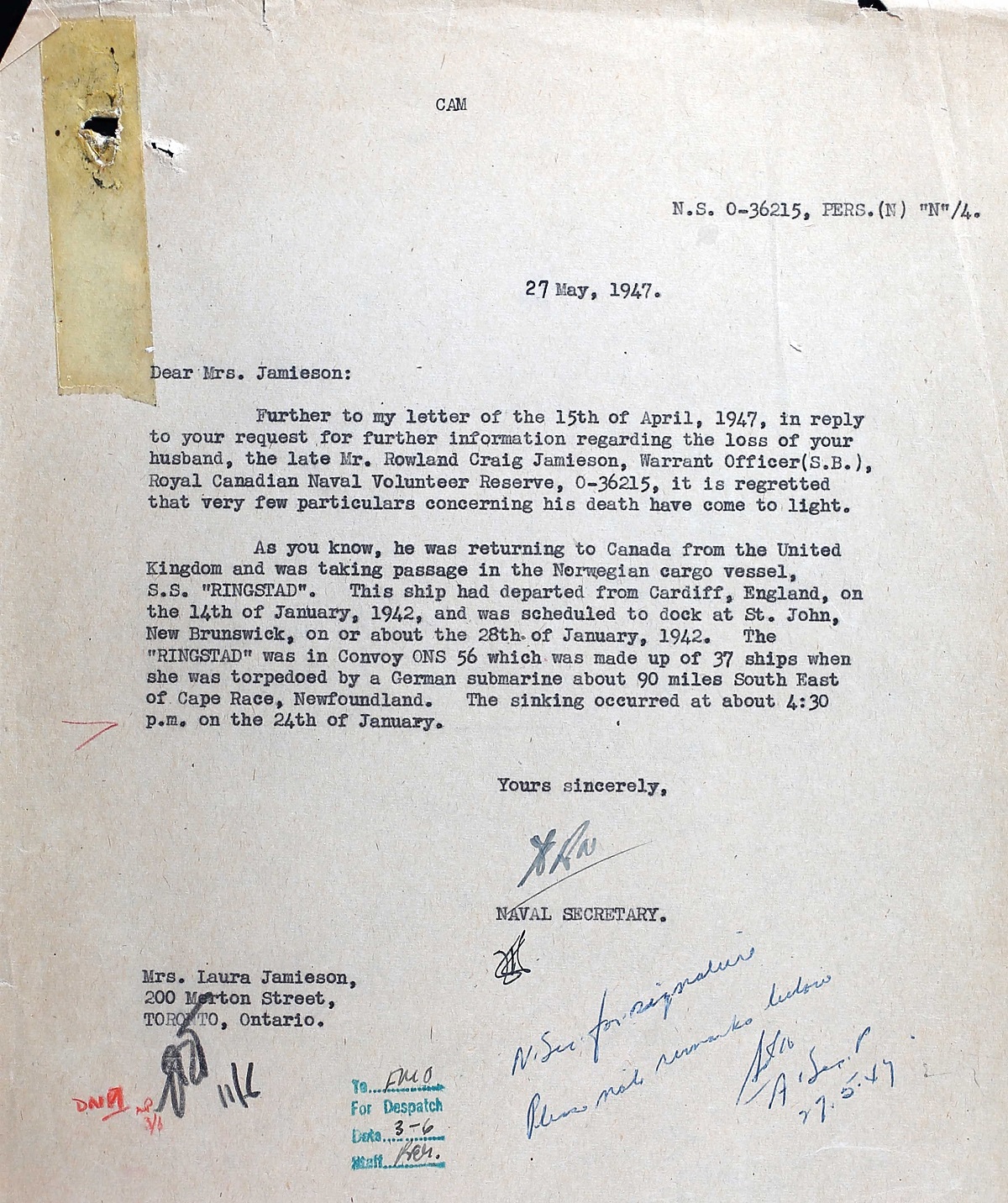 Warrant Officer R. C. Jamieson was returning to Canada from United Kingdom. He was a passenger on Norwegian cargo vessel SS Ringstad. This ship had departed from Cardiff, England, on Jan. 14, 1942 and was scheduled to dock at St. John New Brunswick on or about Jan. 28, 1942. The SS Ringstad was in Convoy ONS 56 which was made up of 36 ships when she was torpedoed by a German Submarine U-333 about 90 miles south east of Cape Race Newfoundland. The sinking occurred at about 04:30 hrs. on Jan. 24, 1942.