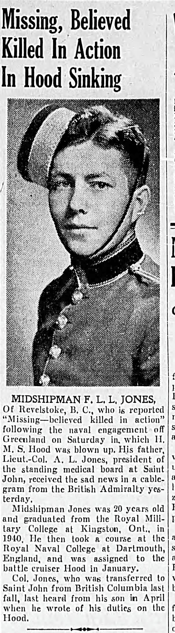 JONES, Francis Llewelyn Lloyd, Midshipman, RCN, MPK - 24 May 1941, HMS HOOD - Son of Lt.-Col. Arthur Llewelyn Jones, O.B.E., M.C., and Marie Anna Rita Jones, of Revelstoke, British Columbia.