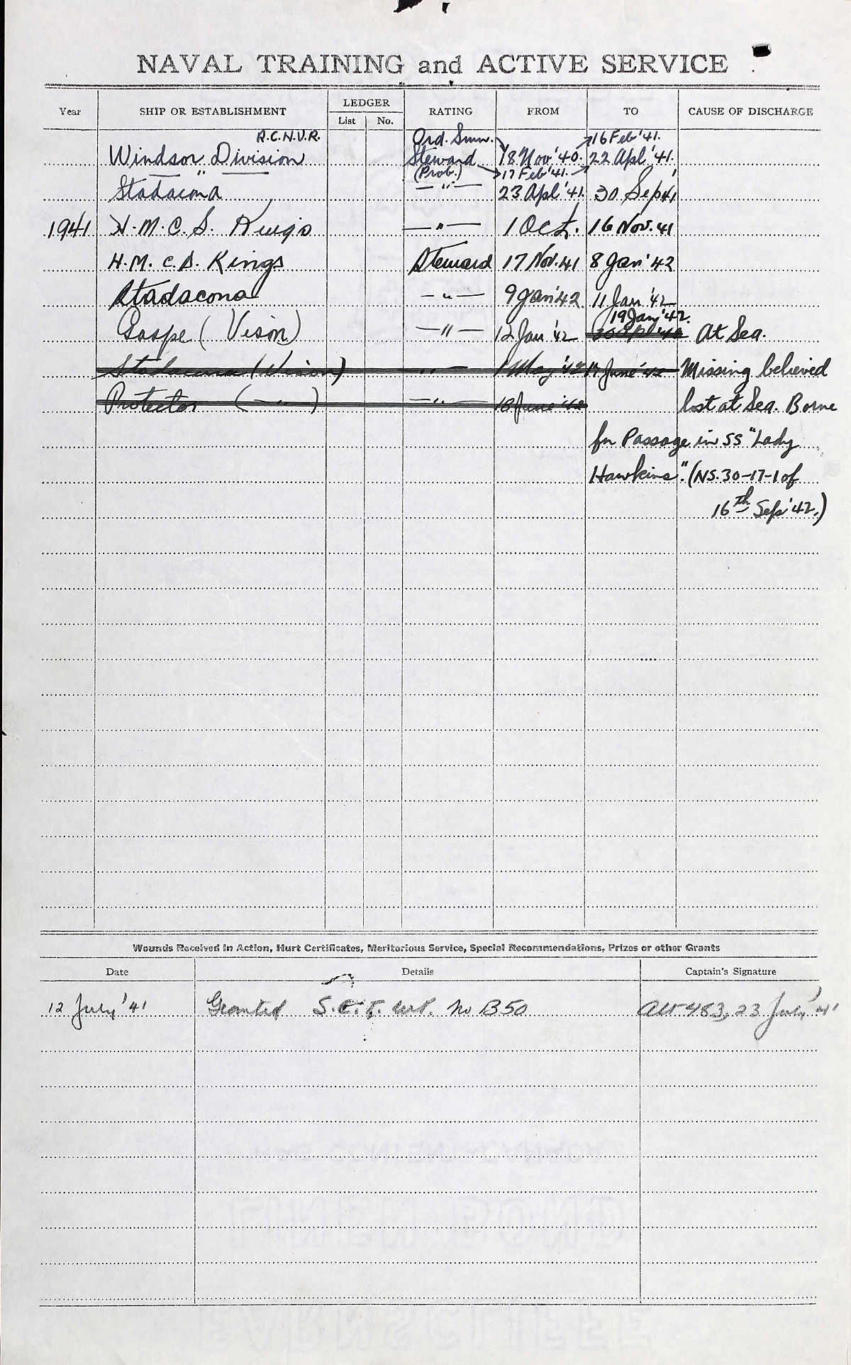 Ships served in: WINDSOR DIVISION RCNVR - Enlisted 18 Nov 1940 * Commenced Active Service 19 Nov 1940 as a Probationary Steward, RCNVR HMCS STADACONA - Drafted to STADACONA 23 Apr 1941 HMCS KINGS - Drafted to KINGS 01 Oct 1941 * Rated Steward, RCNVR 17 Nov 1941 HMCS STADACONA - Drafted to STADACONA 09 Jan 1942 HMCS VISON - Drafted to Vision 12 Jan 1942 as a Steward, RCNVR * Lost at sea while on passage to Trinidad aboard RMS LADY HAWKINS to join VISON.