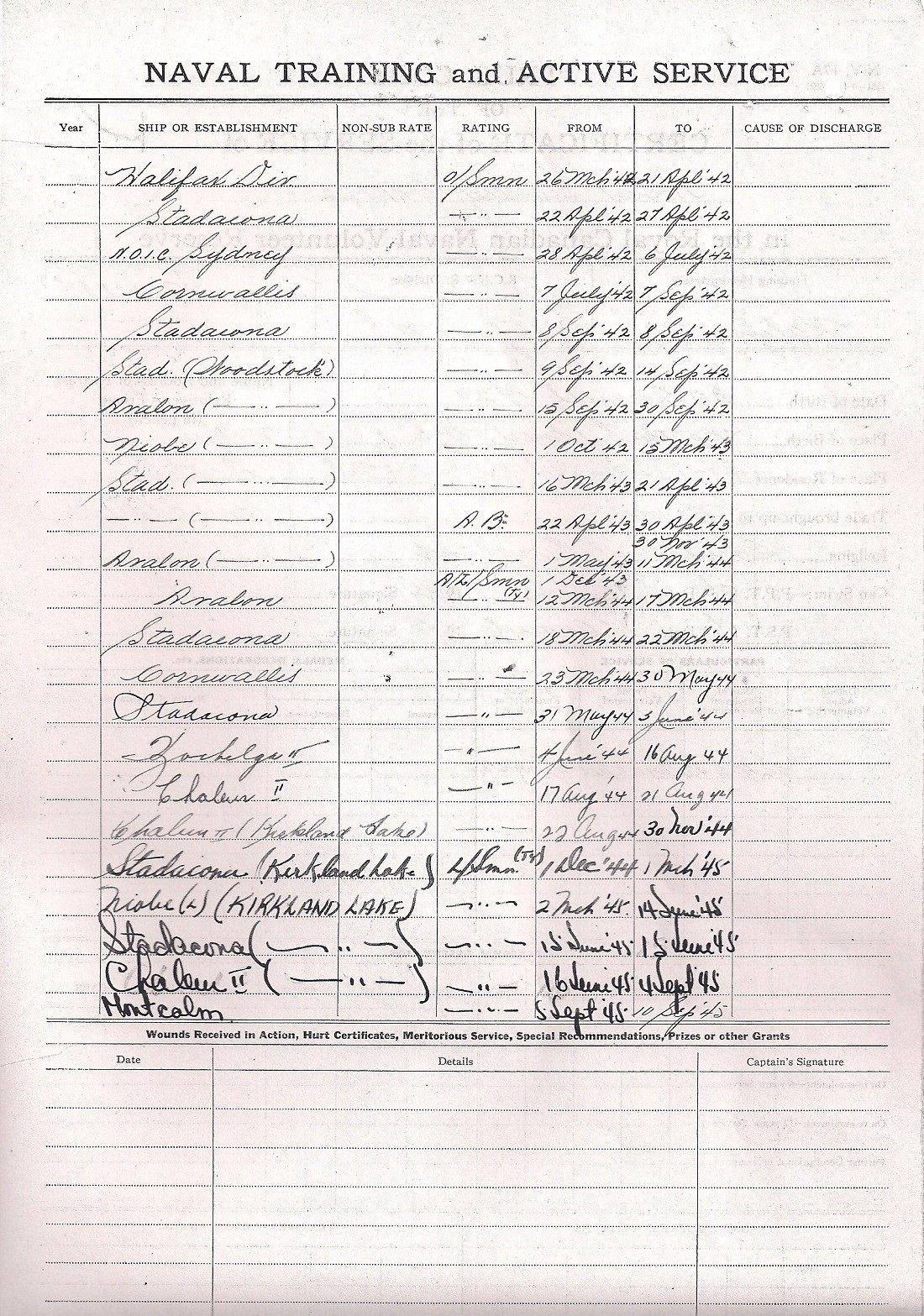 Ships served in: HALIFAX DIVISION RCNVR - Commenced Active Service 26 mar 1942 HMCS WOODSTOCK - Served in WOODSTOCK 09 Sep 1942 - 11 Mar 1944 HMCS KIRKLAND LAKE - Served in KIRKLAND LAKE 22 Aug 1944 - 04 Sep 1945 HMCS MONTCALM - Served in MONTCALM 05 Sep 1945 - 10 Sep 1945