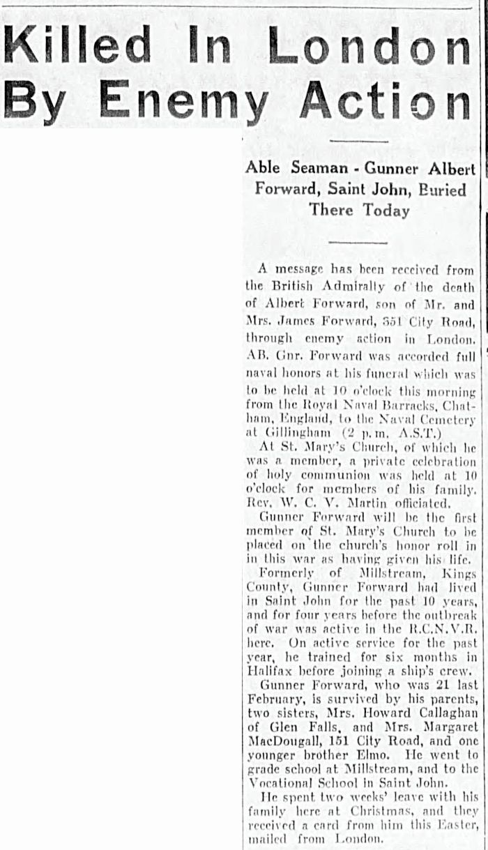 FORWARD, Albert Edward, AB, V2256, RCNVR, Killed - 16 Apr 1941, HMCS ASSINIBOINE - Son of James E. and Ethel A. Forward, of Brookville, Saint John Co., New Brunswick.