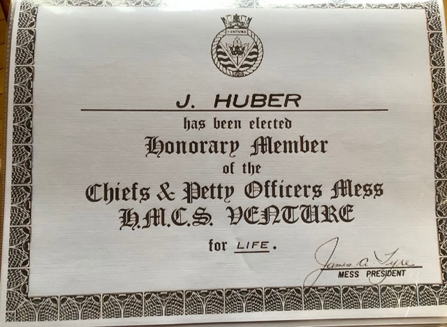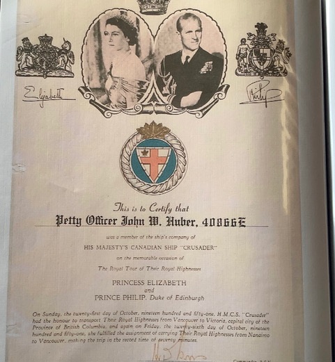 (JH11) Commemorative Certificate for HMCS CRUSADER transporting HRH Princess Elizabeth and Prince Phillip to Vancouver 21 Oct 1951 and 26 Oct 1951 (JH12) Retirement scroll for CPO John Huber (JH13) Lifetime honourary membership to the C&POs Mess, HMCS VENTURE