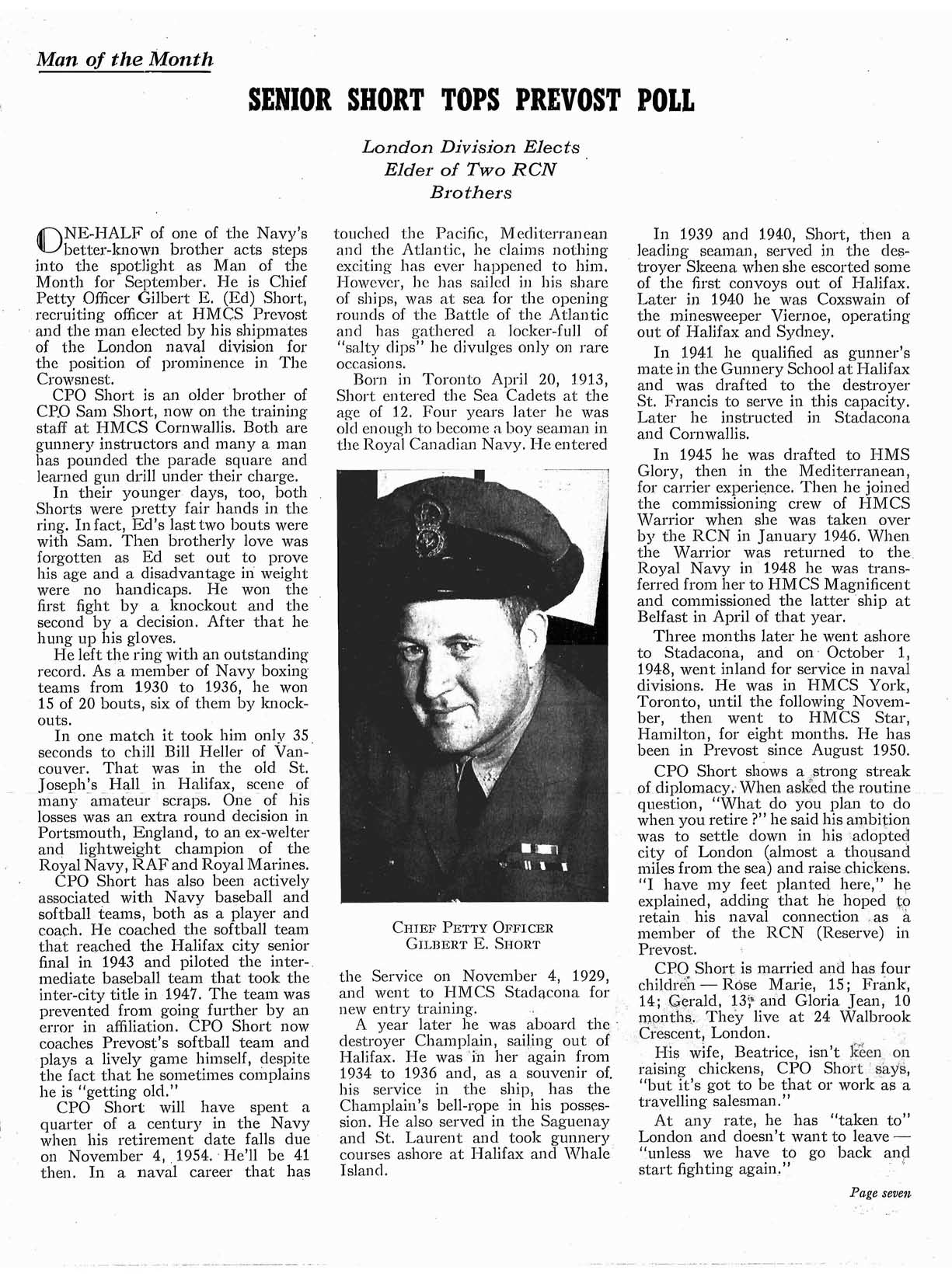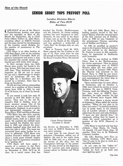 Ships served in: * Enlisted 04 Nov 1929 HMCS CHAMPLAIN - Served in CHAMPLAIN 04 Sep 1930 - 31 Dec 1931 HMCS SAGUENAY - Served in SAGUENAY -1 Jul 1942 - 31 Dec 1933 as an OS and AB, RCN. Rated AB 01 Apr 1933 HMCS CHAMPLAIN - Served in CHAMPLAIN 20 Jun 1934 - 10 Jan 1936 as an AB, RCN HMCS CHAMPLAIN - Served in CHAMPLAIN 17 Jun 1936 - 24 Nov 1936 as an AB, RCN HMCS ST LAURENT - Served in ST LAURENT 31 Jan 1937 - 30 Jul 1937 as an AB and A/LS, RCN. Rated A/LS 15 Jun 1937 HMCS SAGUENAY - Served in SAGUENAY 19 Oct 1937 - 14 Nov 1938 as an A/LS and LS, RCN. Rated LS 15 Aug 1938 HMCS SKEENA - Served in SKEENA 19 Apr 1939 - 16 Jan 1940 as a LS, RCN HMCS VIERNOE - Served in VIERNOE 01 Feb 1940 - 18 Oct 1940 as an A/PO, RCN, Cox'n HMCS ST FRANCIS - Served in ST FRANCIS 04 Feb 1942 - 07 Sep 1942 as a PO, RCN HMS GLORY - Served in HMS GLORY 25 Apr 1945 - 26 Jun 1945 as a CPO, RCN HMCS WARRIOR - Served in WARRIOR 24 Jan 1946 - 04 Nov 1946 as a CPO, RCN HMCS WARRIOR - Served in WARRIOR 21 Jul 1947 - 26 Feb 1948 as a CPO, RCN HMCS MAGNIFICENT - Served in MAGNIFICENT 27 Feb 1948 - 18 Jul 1948 as a CPO and C1GI3. Classed C1GI3 01 Jul 1948 HMCS YORK - Served in YORK 01 Oct 1948 - 09 Jan 1950 HMCS STAR - Served in STAR 11 Jan 1950 - 06 Aug 1950 HMCS PROVOST - Served in PREVOST 07 Aug 1950 - 16 Apr 1954 HMCS YORK - Drafted to YORK 17 Apr 1954 * Honourably released 04 Nov 1954 * Enlisted in the RCN(R) at London (HMCS PREVOST), ON 04 Nov 1954 as an AB, RCN(R). Rated C1GI4 05 Nov 1954 HMCS PREVOST - Served in PREVOST 04 Nov 1954 - 11 Mar 1955 as a CPO1, RCN(R) HMCS PREVOST - Served in PREVOST 24 Mar 1956 - 14 May 1945 as a CPO1, RCN(R) HMCS PATRIOT - Served in PATRIOT 15 May 1956 - 10 Aug 1956 as a CPO1, RCN(R) HMCS PREVOST - Served in PREVOST 11-12 Aug 1956 as a CPO1, RCN(R) HMCS PATRIOT - Served in PATRIOT 13 Aug 1956 - 10 Sep 1956 as a CPO1, RCN(R) HMCS PREVOST - Drafted to PREVOST 11 Sep 1956 as a CPO1, RCN(R) * Retired. Placed on Emergency List - 12 Mar 1958
